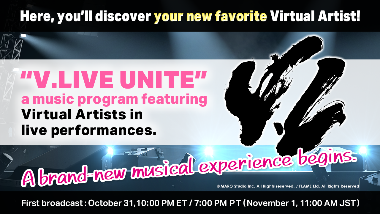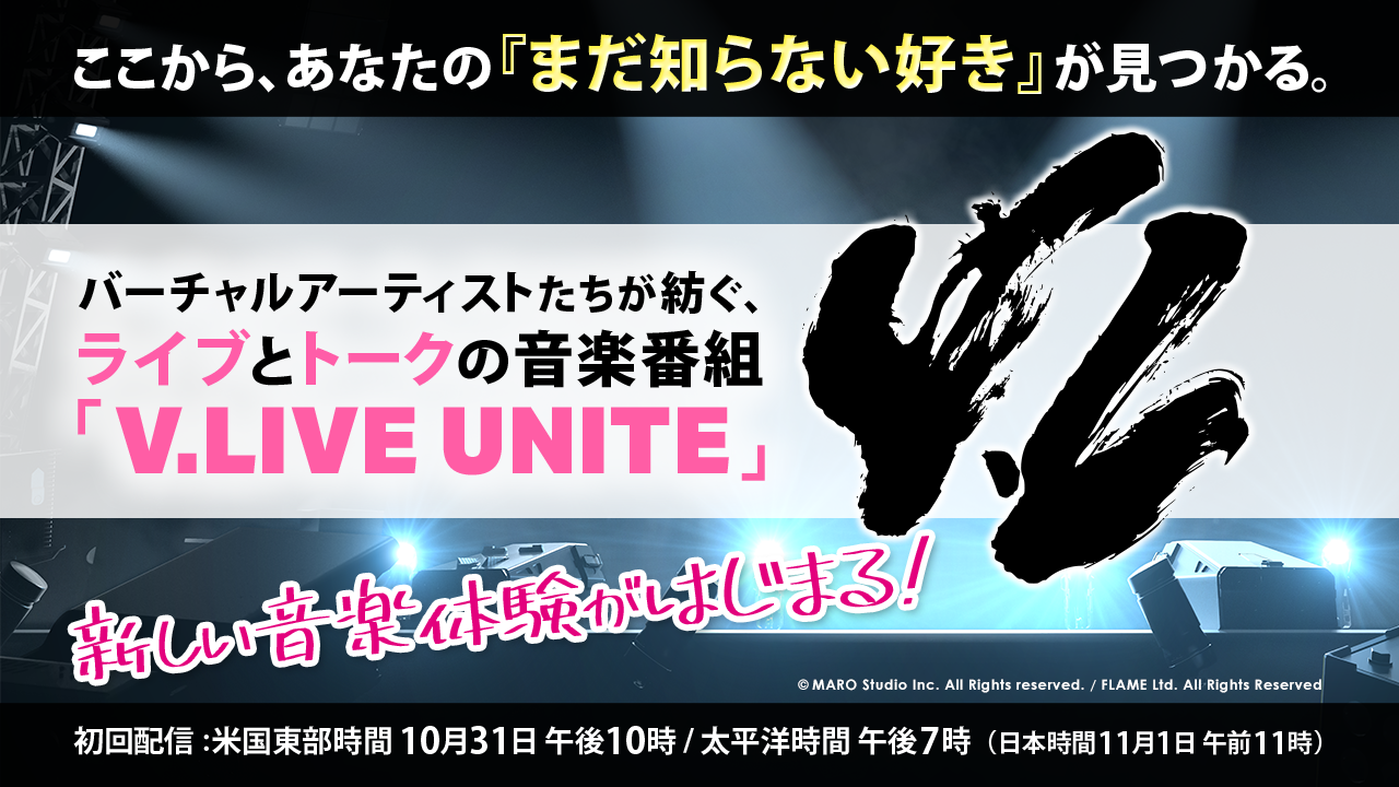 「V.LIVE UNITE」は、“まだ知られていない『好き』を届ける”をコンセプトに、バーチャルアーティストやVTuberによるライブパフォーマンスとトークを融合した新感覚のバーチャル音楽番組です。
