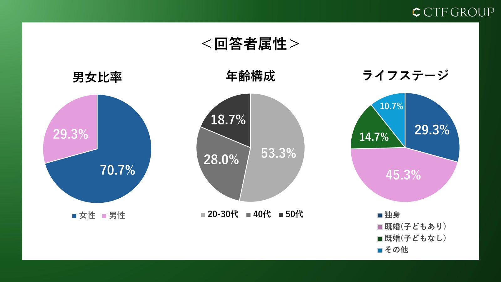 ・ライフステージ:既婚・子育て世代が45.3%(34名)、独身が29.3%(22名)、その他25.4%(19名)