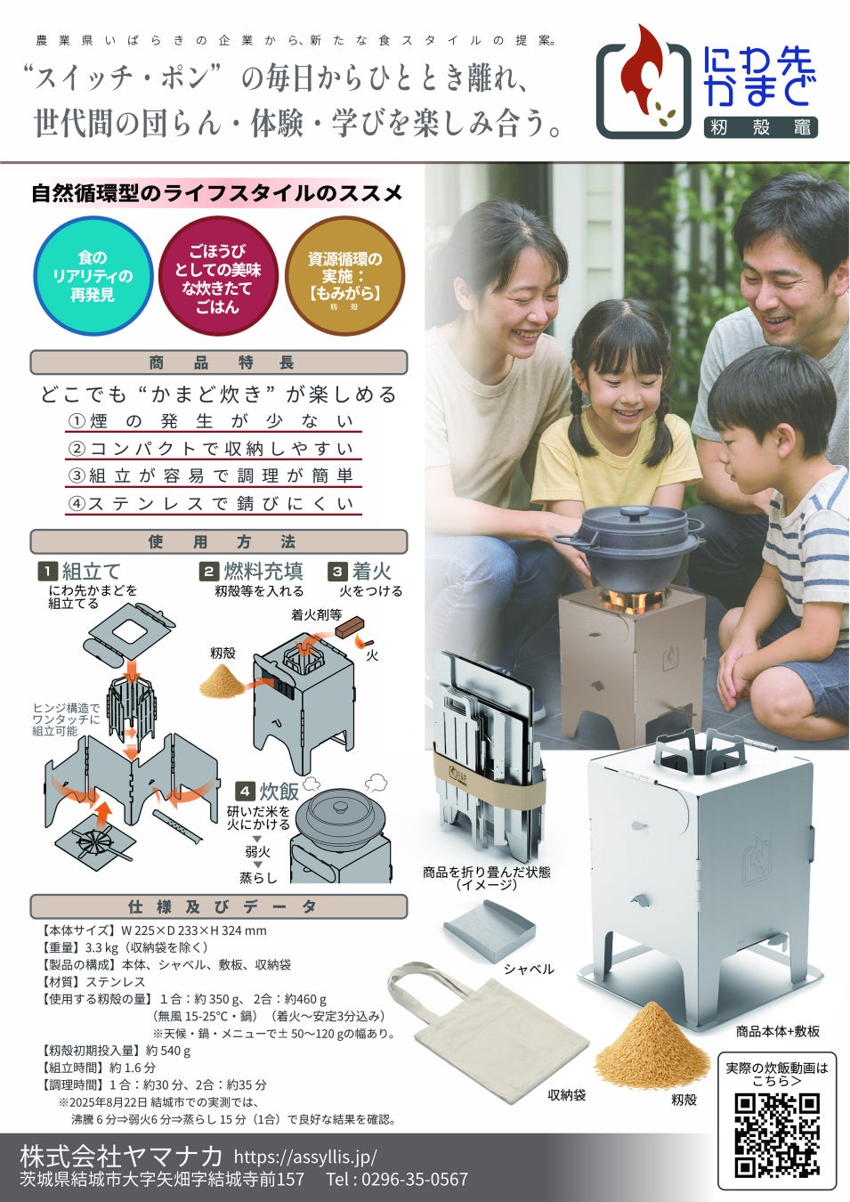 金属製品製造を手がける株式会社ヤマナカ(本社:茨城県結城市 代表取締役社長:山中崇)が展開するライフスタイルブランド「Assyllis(アッシーリス)」において、主力製品の折りたたみ式もみ殻燃料かまど「にわ先かまど」を核とした取り組みが、このたび、「いばらきデザインセレクション2025 選定」の受賞と「第38回優秀板金製品技能フェア 技能奨励賞」の受賞という、二つの分野で評価されました。
