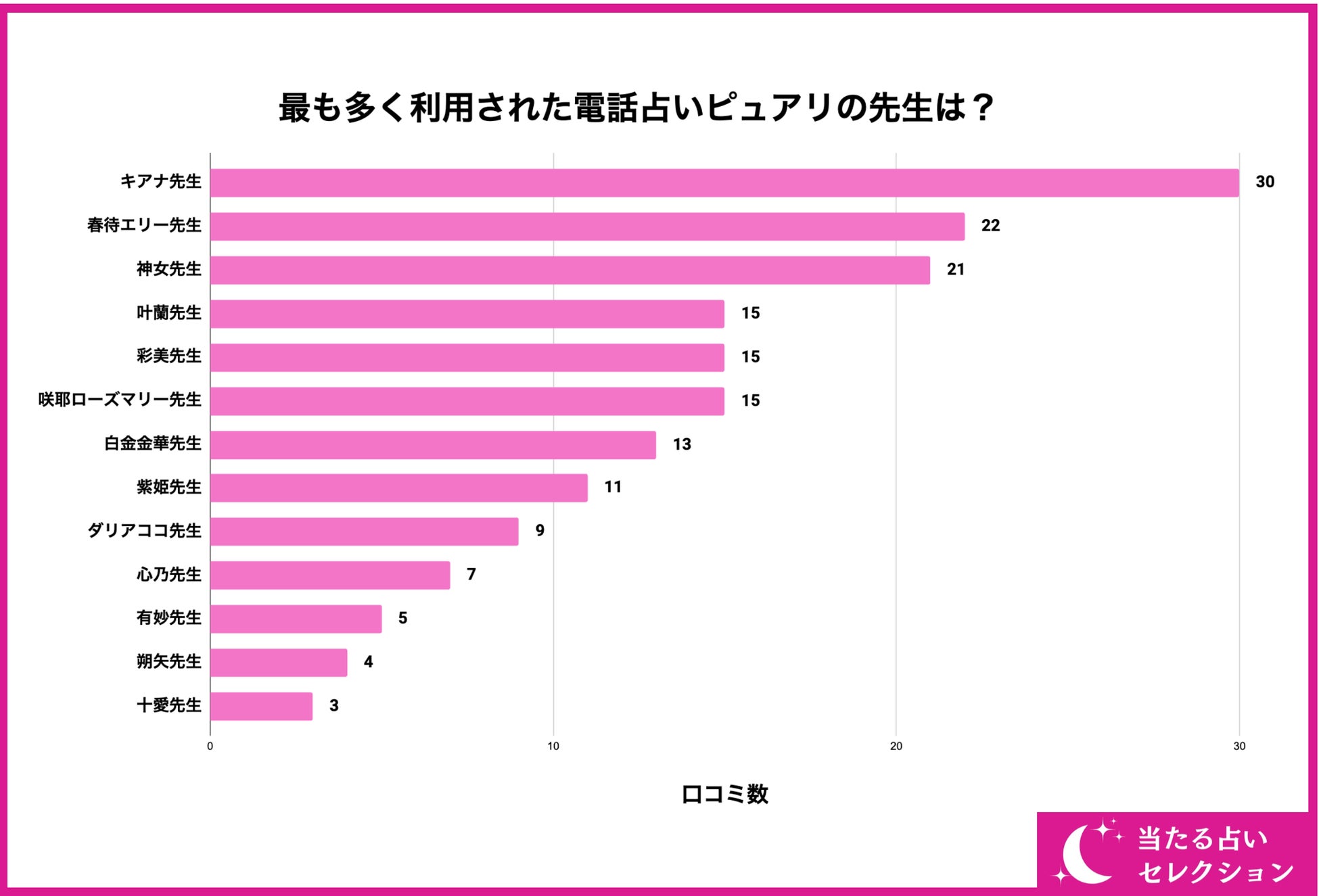 続いて、170名の利用者のうち最も多く利用された電話占いピュアリの先生をご紹介していきます。結論から言うと、『キアナ先生』や『春待エリー先生』、『神女先生』といった有名な先生が上位となりました。やはり人気の先生は色々な記事や特集で見ることも多く、認知度や知名度が高いため利用者数も多くなっています。さらに、口コミに関しても高評価が多いため、そこからさらにお客さんが集まってくるサイクルになっていると考えられます。