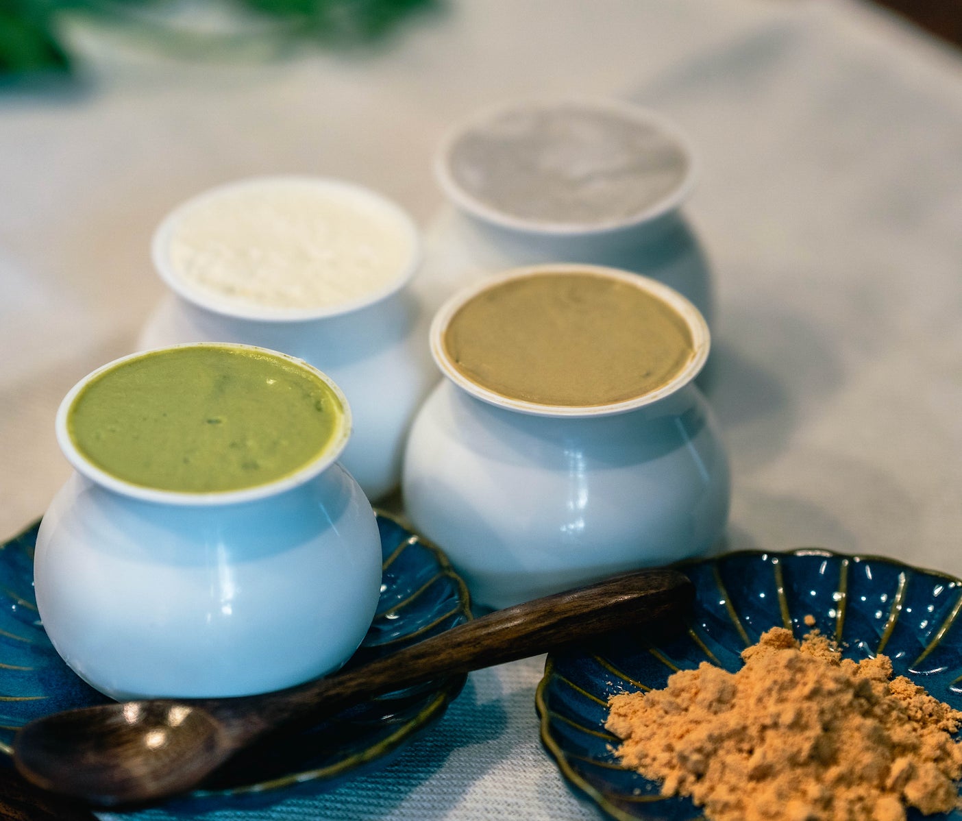 そのほか、カップに入ったわらびもちの上に生クリームをのせ、好みできな粉をかける「クリームわらびもち」は「プレーン」「ほうじ茶」「黒胡麻」「抹茶」の4種類をご用意しております。(4個入り1,800円)