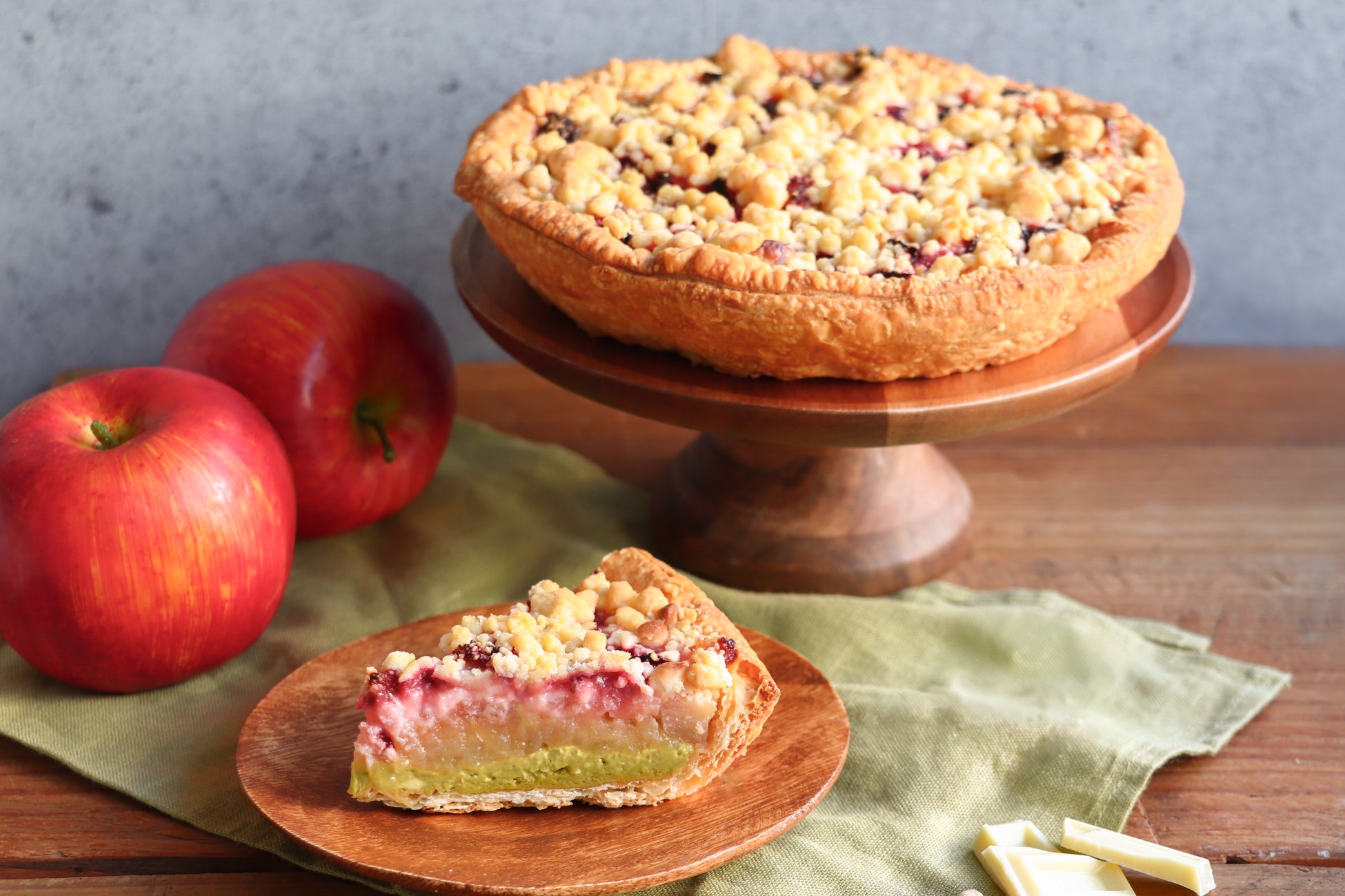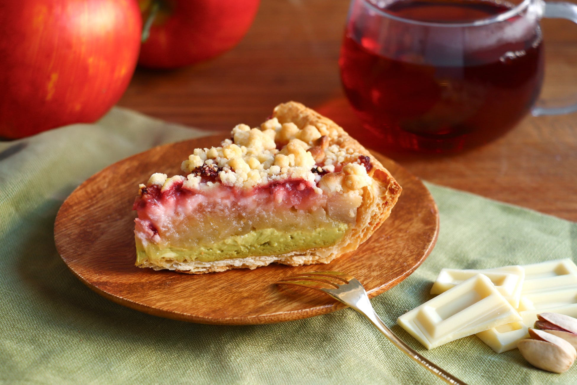 香ばしいピスタチオ風味の濃厚なクリームチーズに、やさしい甘さのホワイトチョコレートを贅沢に重ね、たっぷりのりんごと甘酸っぱいいちごをのせて焼き上げました。
