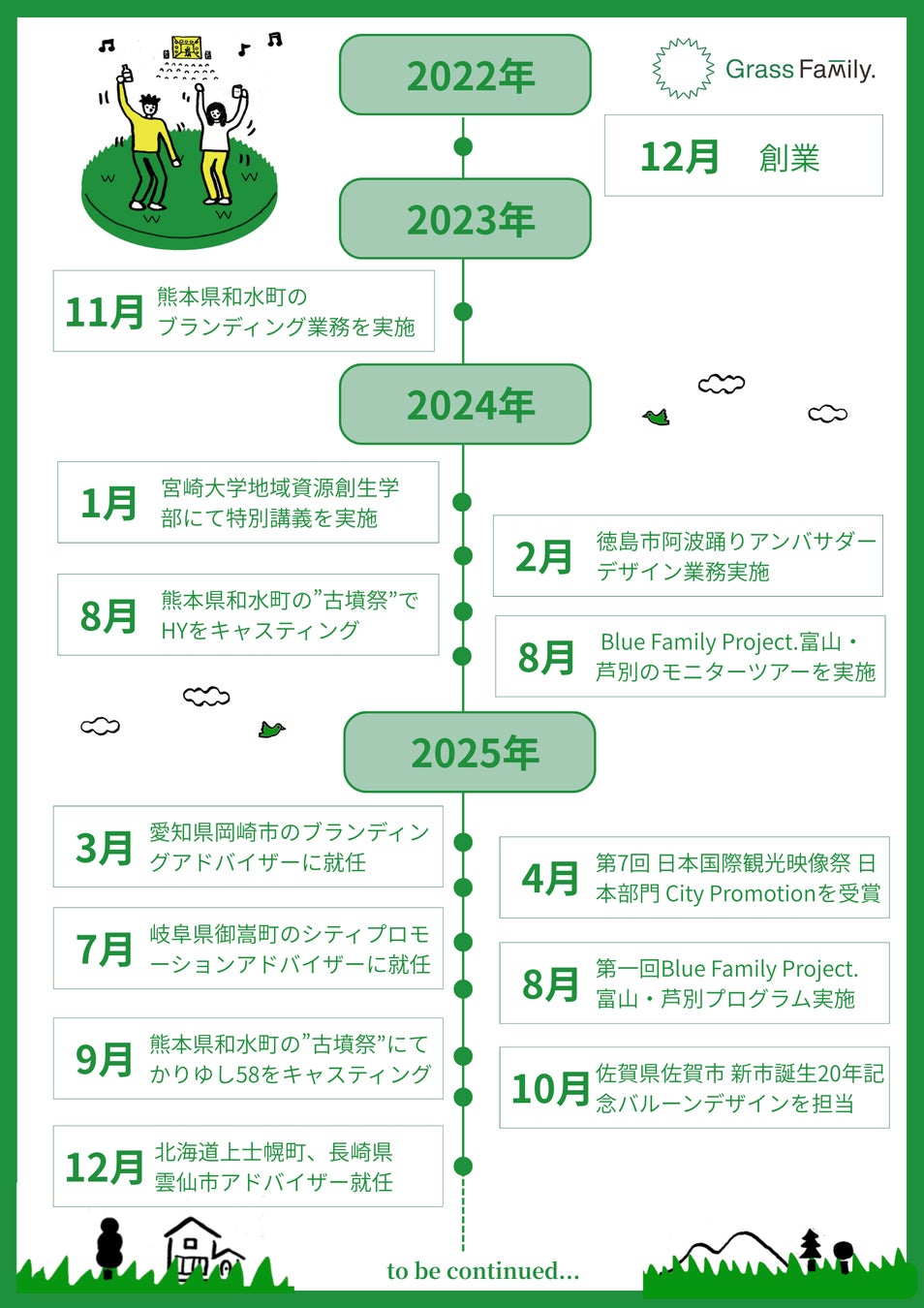 地域と人をつなぎ、次の時代に残る新しい価値をプロデュースする地域共創カンパニーの株式会社Grass Family.(本社:神奈川県海老名市、代表:荻野 孝史、以下「Grass Family.」)は、2025年12月12日に創業3周年を迎えました。この節目を受け、Grass Family.がこの3年間で全国の自治体や地域とともに取り組んできた地域ブランディング、並びに原体験を起点とした関係人口創出の実践知をまとめた実績ガイドブックを公開いたします。あわせて、これまで大切にしてきた想いを言語化し直したMVV(ミッション・ビジョン・バリュー)をアップデートし、次のフェーズに向けた歩みを発信してまいります。