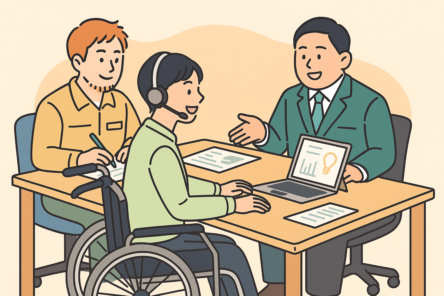 具体的には「就労支援機関」「ジョブコーチ」「就労支援を行う専門職」「リハビリテーションエンジニア」「支援機器と障害特性を調整できる医療福祉等の専門職」等を想定しています。