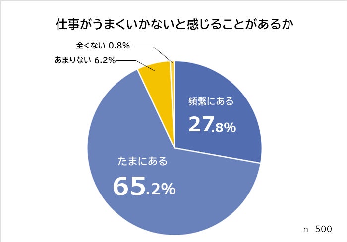社会人の男女500人に「仕事がうまくいかないと感じることがありますか」と聞いたところ、「頻繁にある」「たまにある」という人が合わせて93.0%にのぼりました。9割以上の人が「仕事が捗らない」「効率よく仕事できない」と感じた経験があるのですね。