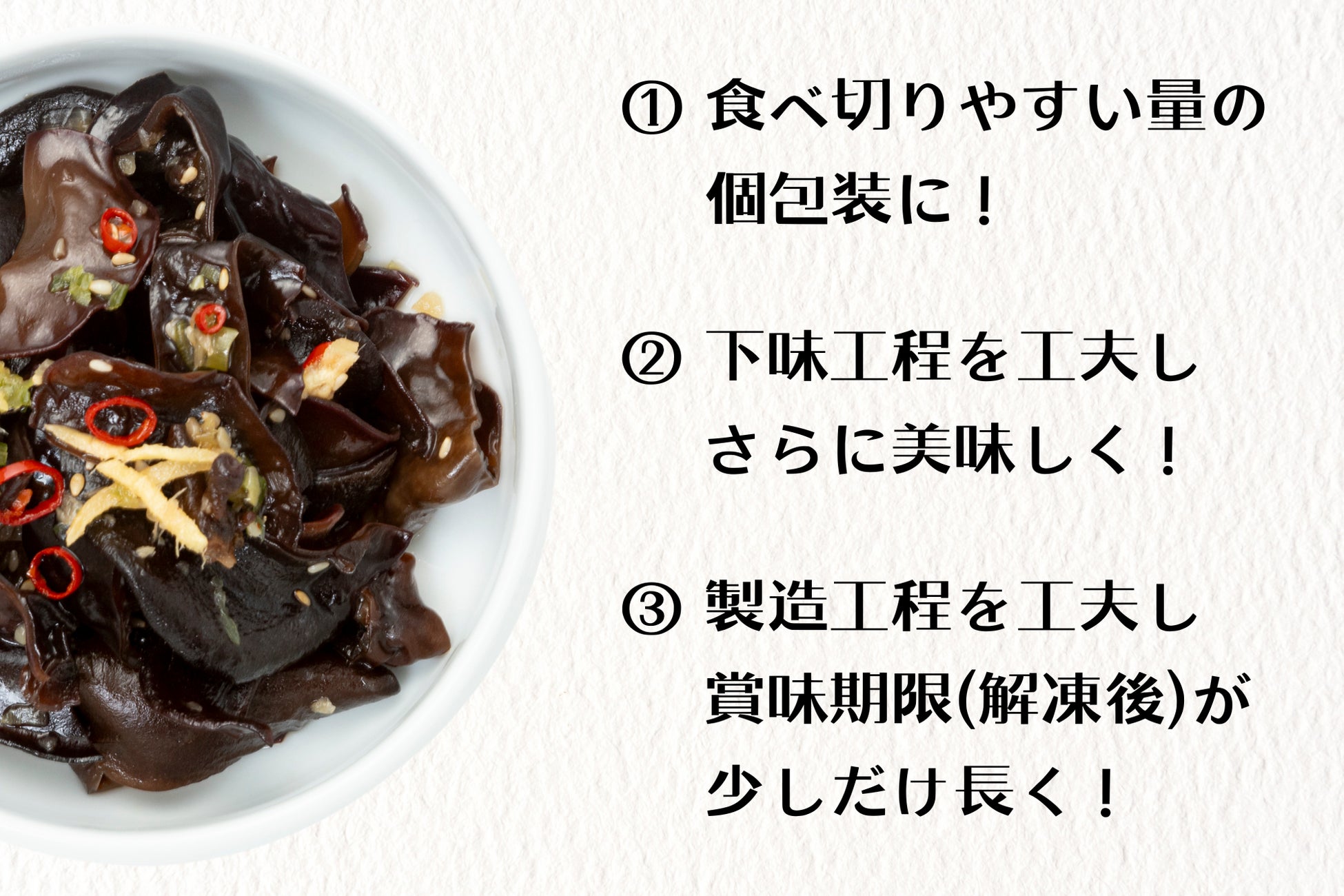 以前の黒きくらげ薬味醤油漬けは袋150g入りで、解凍後の賞味期限が2日と短く、「せっかく買ったのに食べきれない」というお声もいただいたため、少しでもおいしく長く食べていただきたいという想いから、何度も試作を重ねて完成しました。