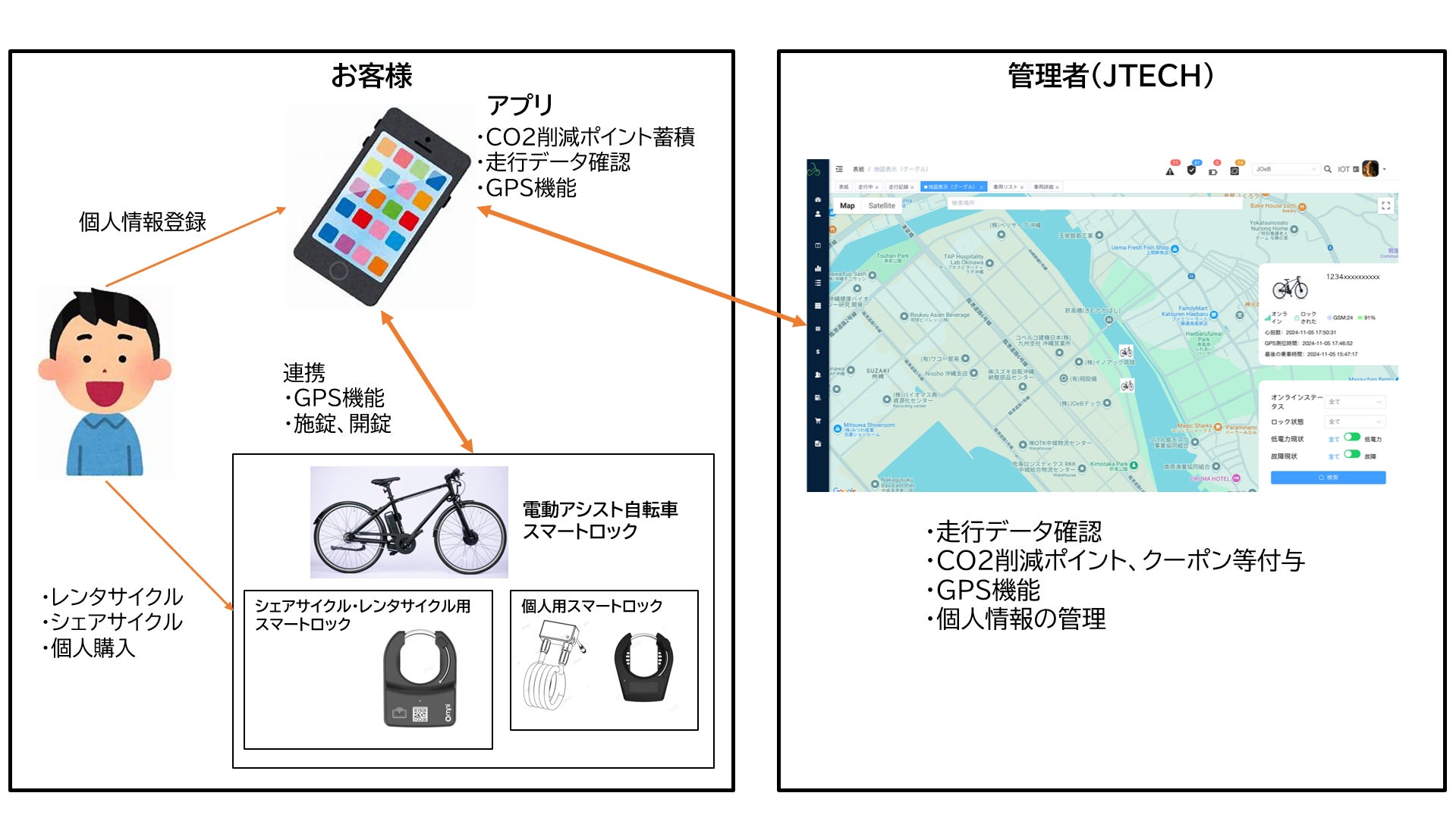 JTECHが管理するスマートロックシステムは、利用者、車両、管理者をつなぐ画期的な仕組みです。