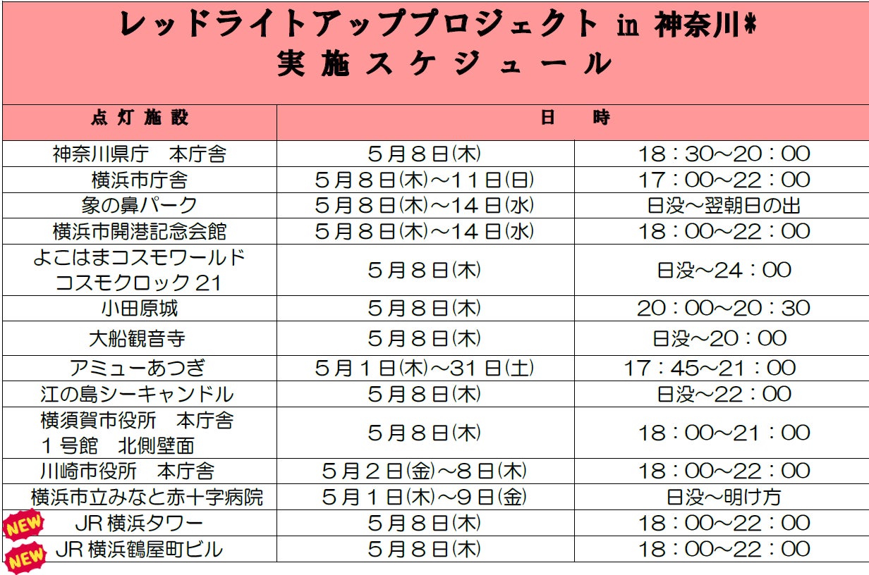 赤十字では、2018年から全国各地の歴史的建造物やランドマークとなる建物等をシンボルカラーである“赤色"に点灯することで、― 国内外の自然災害、世界の人道危機で苦しんでいる人に思いを馳せて欲しい ―という強い願いを発信しています。神奈川県内では、5月8日「世界赤十字デー」(創設者:アンリー・デュナン生誕の日)を中心に、観光施設をはじめ過去最多の14カ所をライトアップしました。