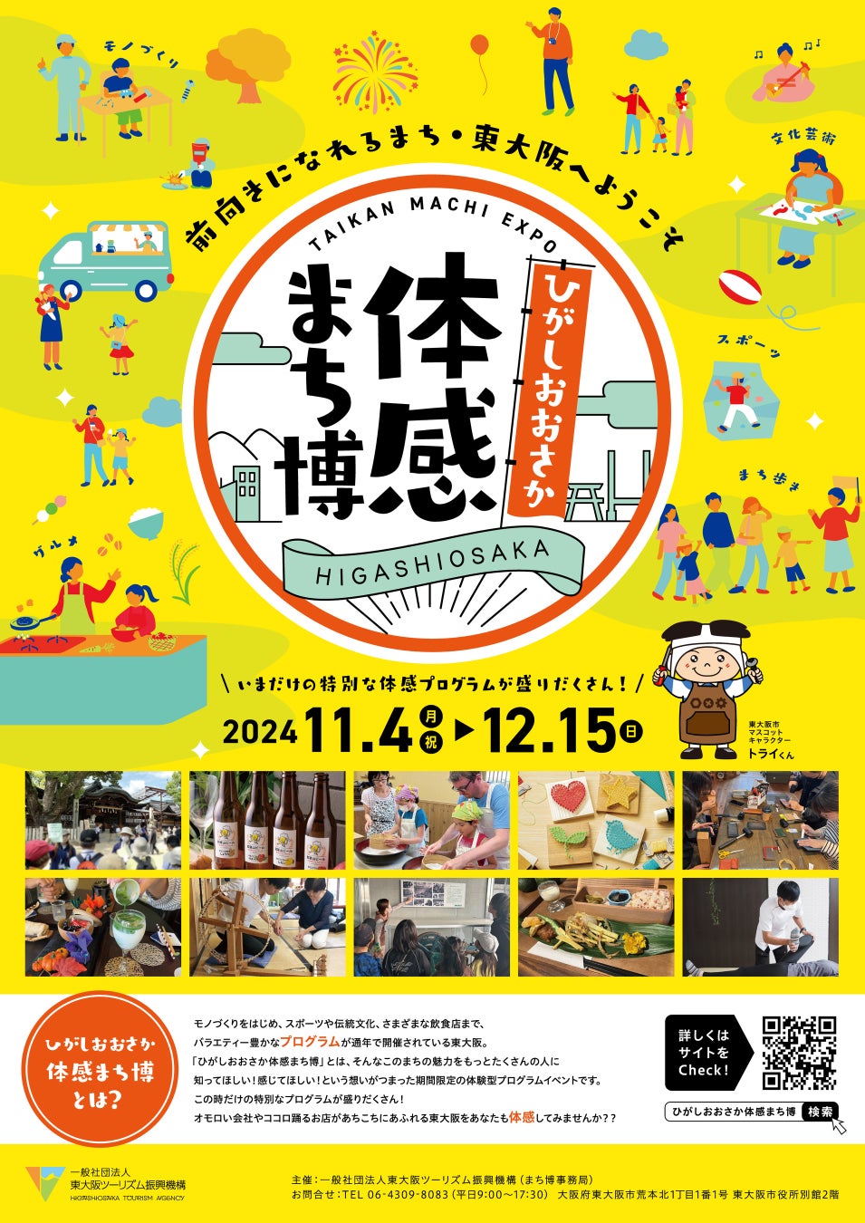 一般社団法人東大阪ツーリズム振興機構(所在地:東大阪市・理事長:高橋一夫)は、約40の東大阪市内の事業者が参加する体験型観光イベント『ひがしおおさか体感まち博2024』を、令和6(2024)年11月4日(月・休)〜12月15日(日)に開催することをお知らせします。今年で7回目となる本イベントを通して、市民や来訪者の皆様にまちの魅力を体感してもらうことで、地域全体の活性化をめざします。