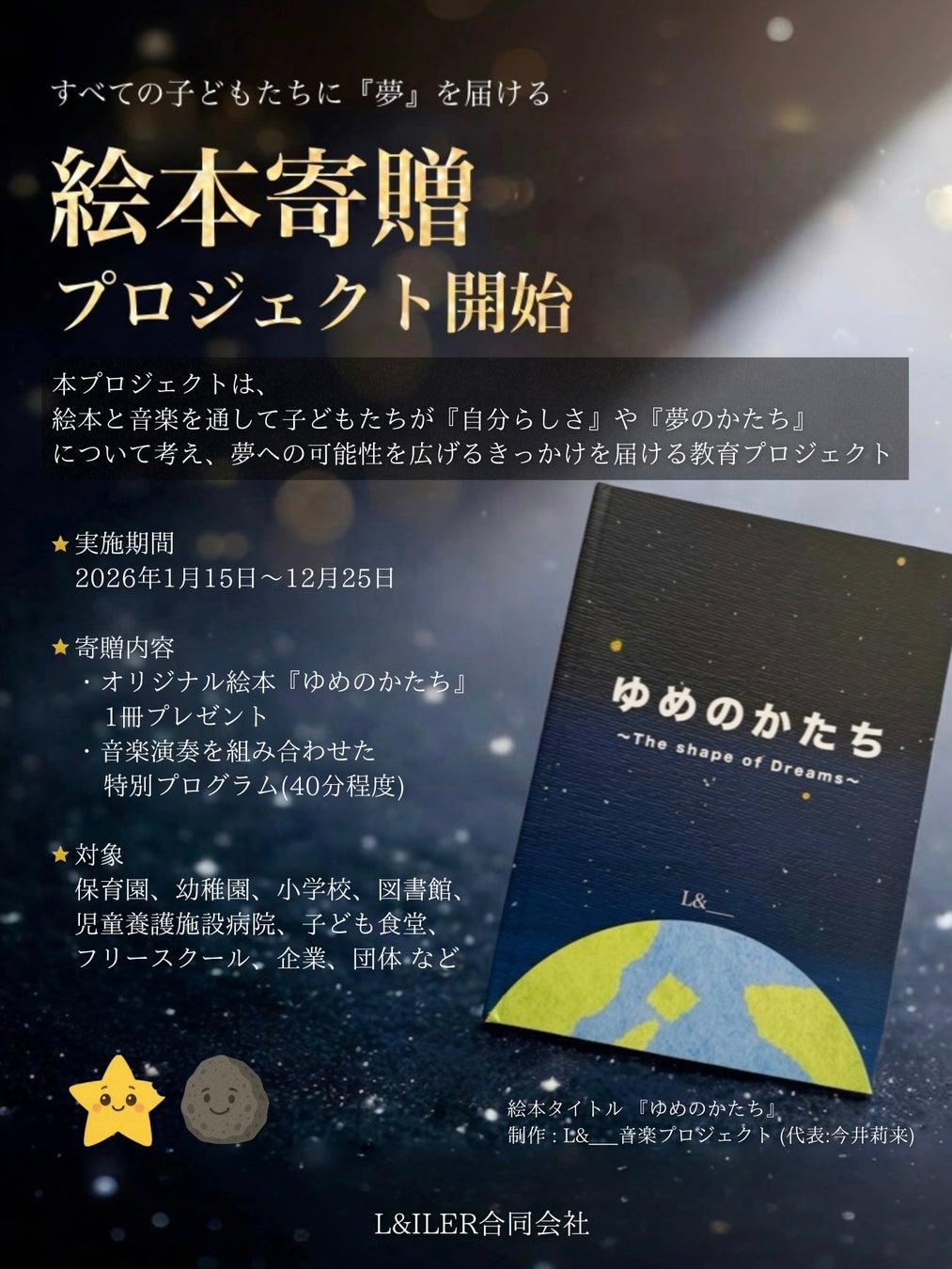 本プロジェクトでは、オリジナル絵本『ゆめのかたち』を、音楽演奏とともに全国の団体・施設・学校へ無償でお届けする教育プロジェクト。