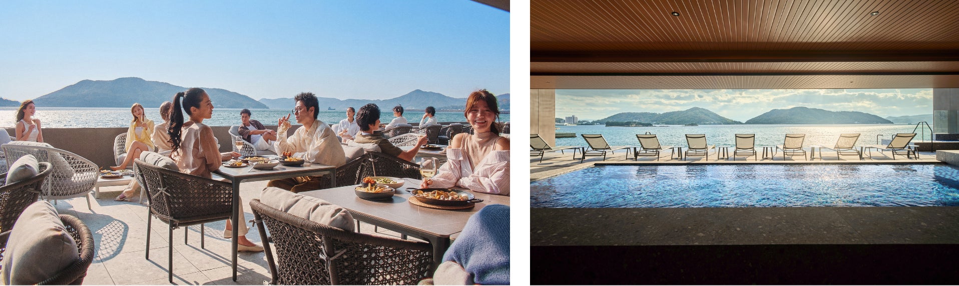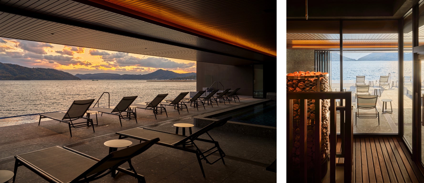 最大20名を収容できる大型のフィンランド式サウナには、オートロウリュ機能を備え、水温15度・深さ1.2mの水風呂のほか、外気浴スペースや、瀬戸内の海や島々と一体になるようなインフィニティプールをご用意。また、多様な温度で身体を温める屋内風呂やジャグジーなど、すべての施設をオーシャンビューで設計しており、天候に左右されることなく、一年を通してご利用いただけます。