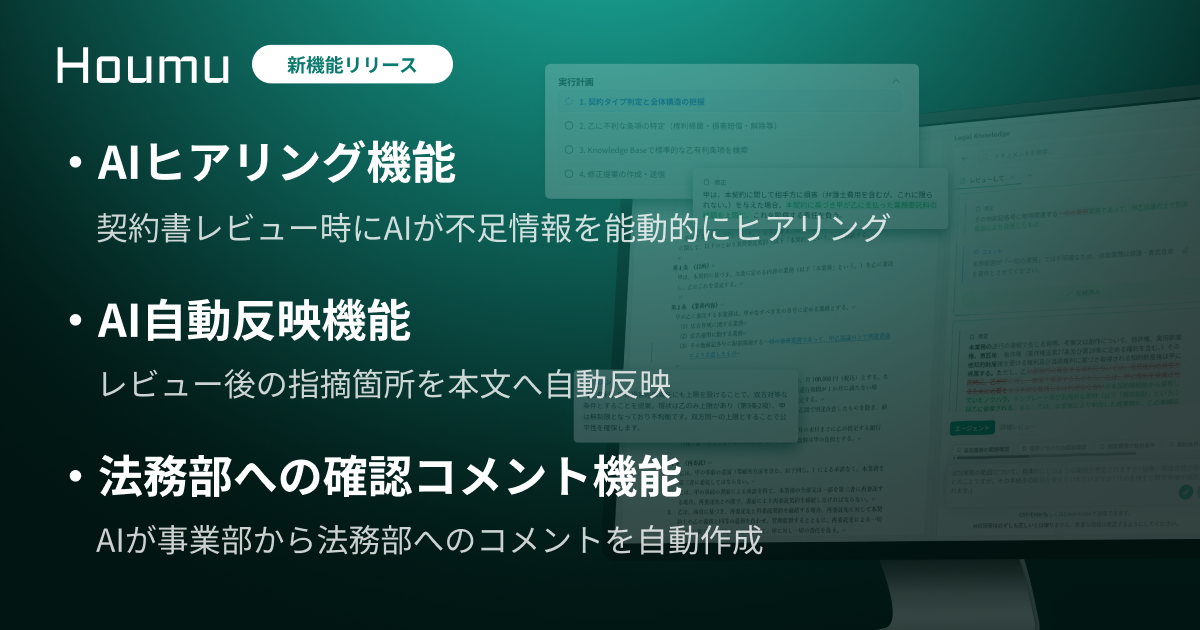 契約審査の差し戻しをゼロへ。法務AIエージェント「Houmu」、事業部・法務部間の「待ち時間」を解消する新機能をリリース