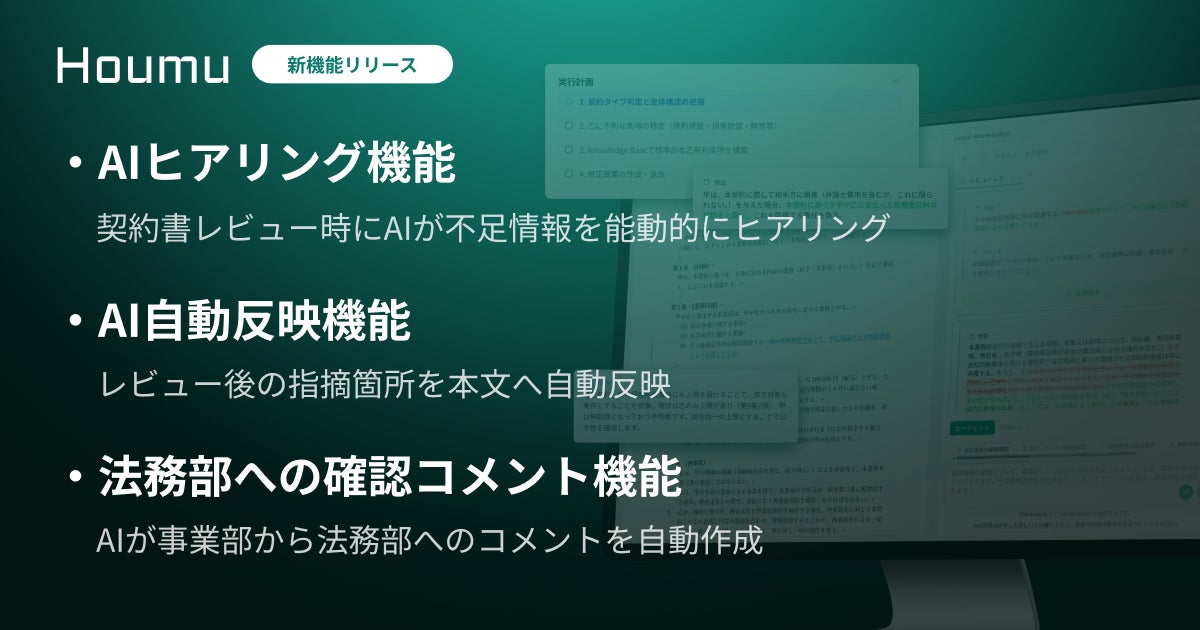 各社オリジナルの法務AIエージェント「Houmu」を提供する株式会社KenRi(ケンリ、以下「KenRi」といいます。)は、法務部だけでなく事業部の活用も想定した新機能「AIヒアリング機能」、「AI自動反映機能」、「法務部への確認コメント機能」をリリースいたしました。