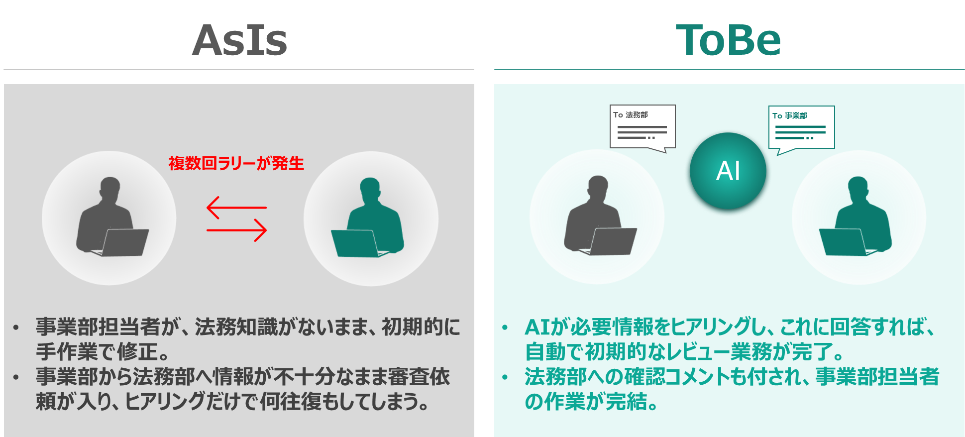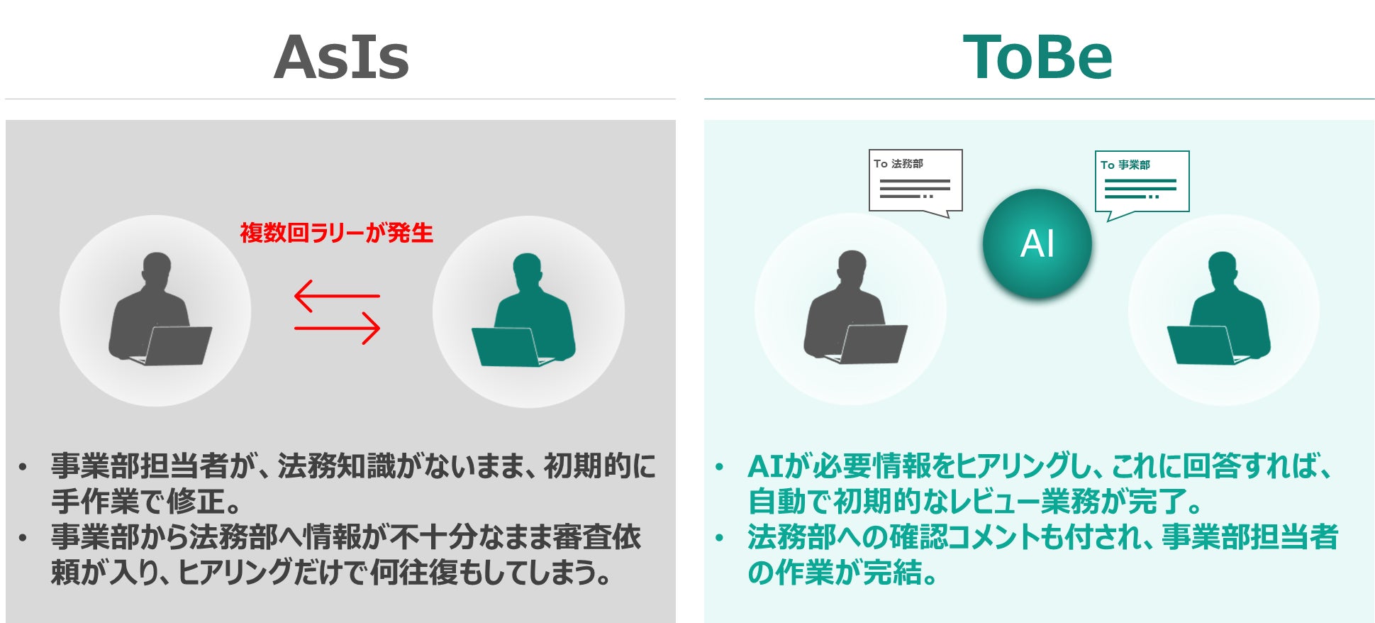 これまでのリーガルテックは、法務部内の業務効率化に主眼が置かれてきました。しかし、契約審査の実務においては、事業部の「情報不足」によって生じる事業部・法務部間の「無数の差戻(ラリー)」が全社的な法務DXのボトルネックになってしまうことも少なくありません。
