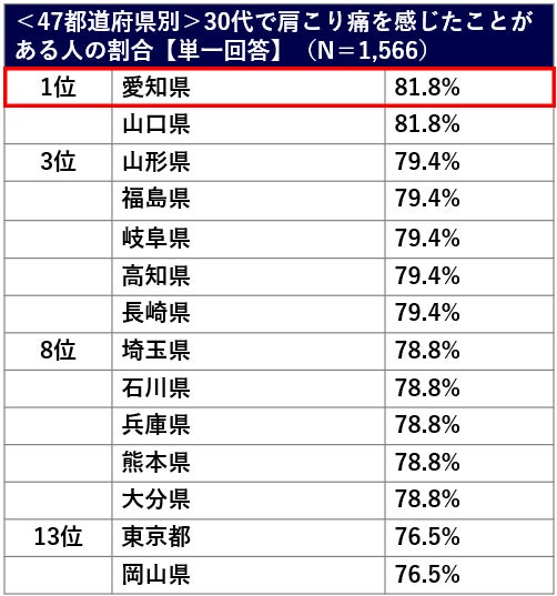 愛知県の中で約8割の人が肩こり痛を感じたことがあり、47都道府県の肩こり痛ランキングの中で愛知県は12位の結果になりました。さらに、「肩こり痛を感じることがとてもある」と回答した男性、「肩こり痛を感じたことがある」と回答した30代の割合は愛知県民が1番高く、愛知県民は比較的、肩こり痛を感じている人が多いことがわかりました。