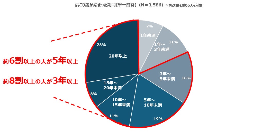 日常生活の中で、肩こり痛を感じやすいタイミングの1位「デスクワークをしているとき(42.6%)」、2位「スマホを触っているとき(28.6%)」、3位「朝起きた直後(25.2%)」という結果が明らかになり、日常的なシーンで起こっています。また、肩こり痛を感じている人の中で、約6割以上の人が5年以上、約8割以上の人が3年以上も肩こり痛を感じていることがわかり、長い期間悩んでいる人が多いことも判明しました。