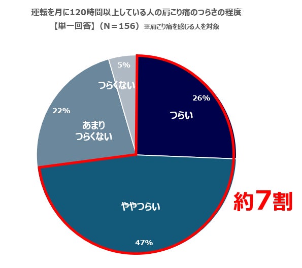 肩こり痛を感じている要因ランキングは、1位「姿勢が悪い(47.7%)」、2位「長時間同じ姿勢でいること(44.0%)」という結果となっており、姿勢と肩こり痛が関連していることが推測されます。また、月にオンラインゲームを120時間以上している人と、180時間以上デスクワークをしている人のうち、肩こり痛を感じたことがある人はいずれも約8割もいます。さらに月に120時間以上運転している人のうち、約7割以上の人が肩こり痛を感じたことあることがわかりました。また、月に120時間以上運転している人のうち、約7割以上の人が肩こり痛がつらいと回答していることから、長時間同じ姿勢をしている人ほど、肩こり痛を感じていることが明らかになっています。