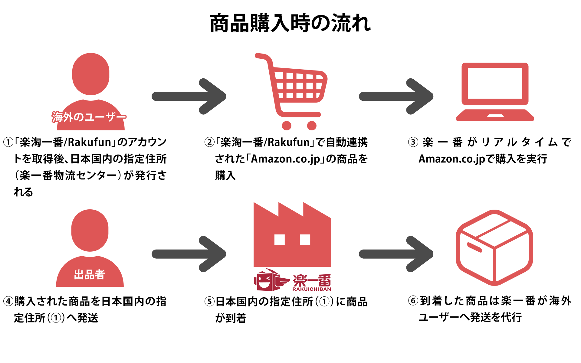 海外のユーザーが「楽淘一番/Rakufun」のアカウントを取得すると、日本国内の指定住所(楽一番物流センター)が発行されます。ユーザーが「楽淘一番/Rakufun」のサイト上で「Amazon.jp」の商品を購入する際、「楽淘一番/Rakufun」から発行された日本国内の指定住所をお届け先に設定。商品が指定住所に到着後、海外への配送は「楽一番」が代行いたします。