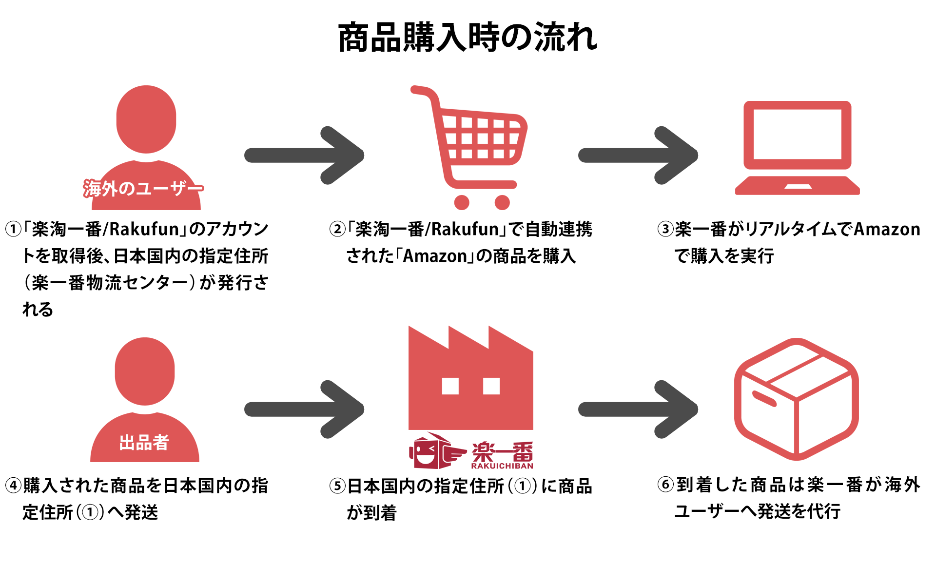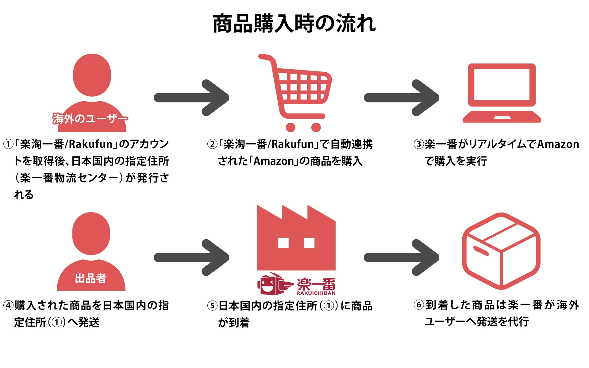 海外のユーザーが「楽淘一番/Rakufun」のアカウントを取得すると、日本国内の指定住所(楽一番物流センター)が発行されます。ユーザーが「楽淘一番/Rakufun」のサイト上で「Amazon」の商品を購入する際、「楽淘一番/Rakufun」から発行された日本国内の指定住所をお届け先に設定。商品が指定住所に到着後、海外への配送は「楽一番」が代行いたします。