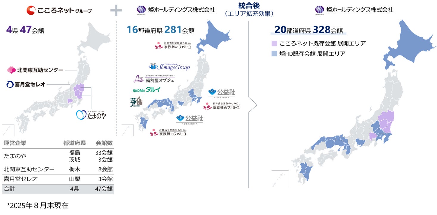 これまでの両社の事業エリアは、まったく重複しておらず、お互いに補完することとなります。当社グループは10年ビジョンの重要な取組みとして「葬儀事業の拡大」を掲げ、全国への事業エリアの拡大、550会館体制構築の実現を目標にしています。今回の経営統合により、新たに47会館が当社グループの会館として加わり、さらに前進することとなります。事業エリアに関しても、福島、茨城、栃木、山梨が新たなエリアとして加わり、当社グループの事業エリアは20都道府県へと広がります。