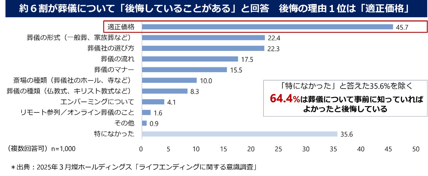 「葬儀のことで知っておけばよかったと後悔していること」という質問に対して、「適正価格がわからなかったこと」と、45.7%もの人が答えています。