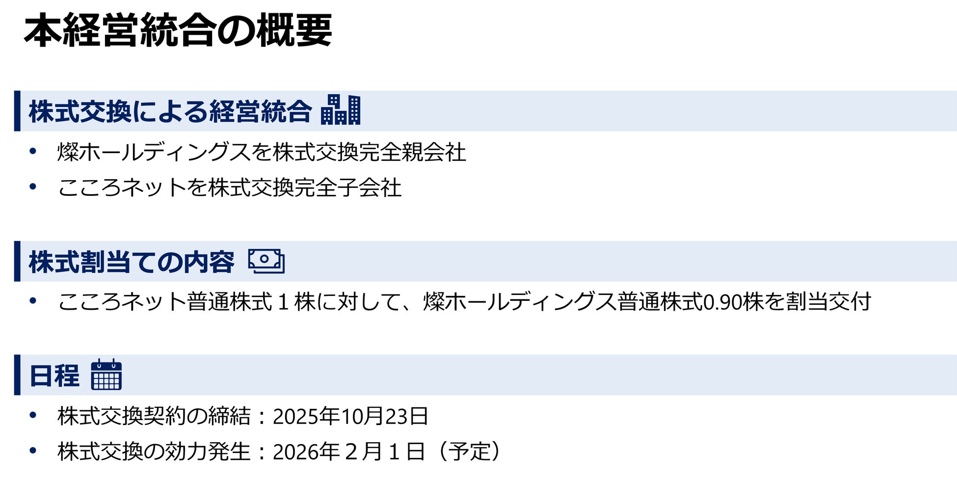 今回のM&Aにおいて、株式交換という手法を選択したのは、こころネットの株主様にも、経営統合後の新しいグループの成長に引き続きご支援賜りたいという考えからです。