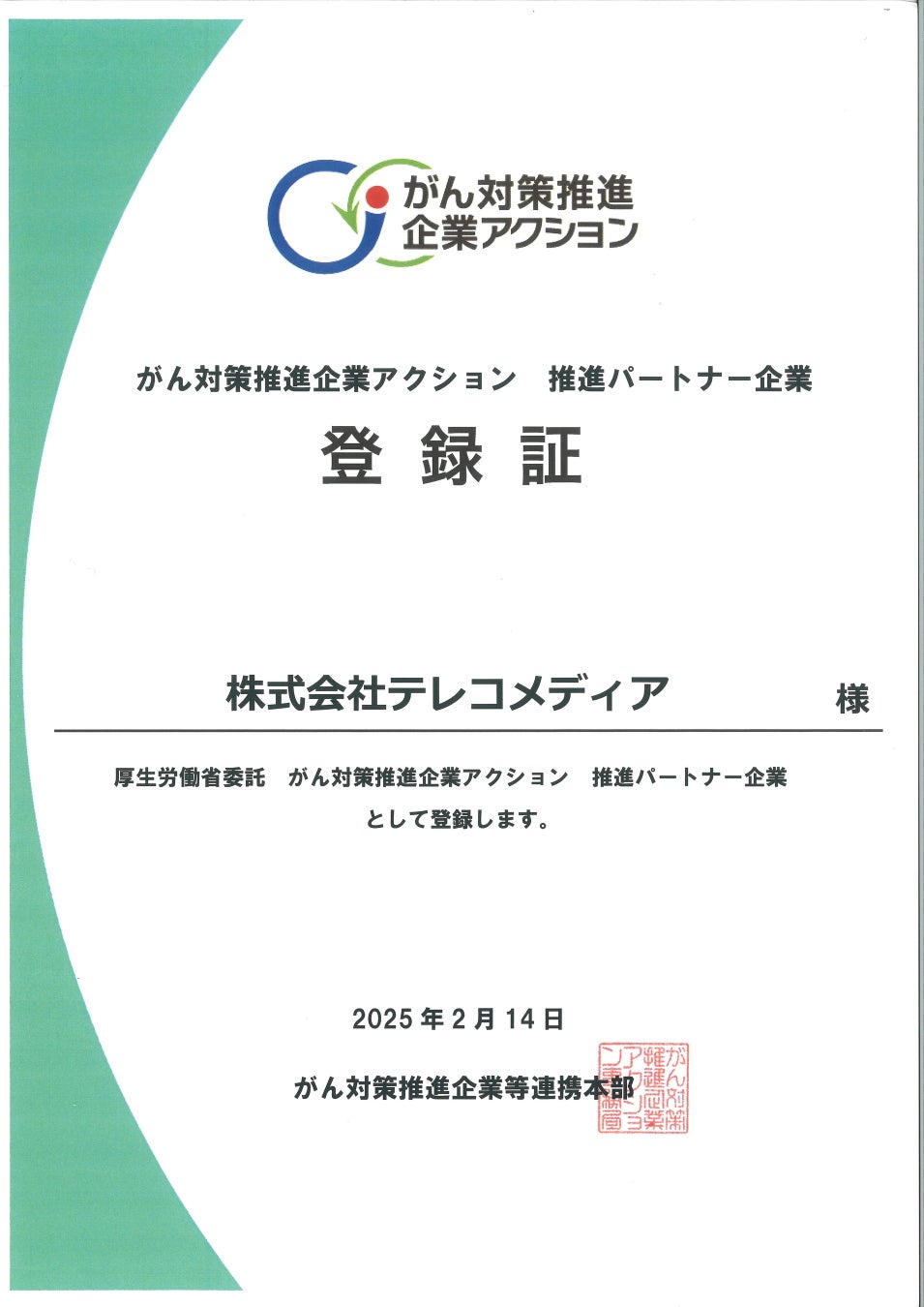 株式会社テレコメディア(本社:東京都、代表取締役:橋本力哉)は、2025年3月に厚生労働省の「がん対策推進企業アクション」の推進パートナーとして認定されました。