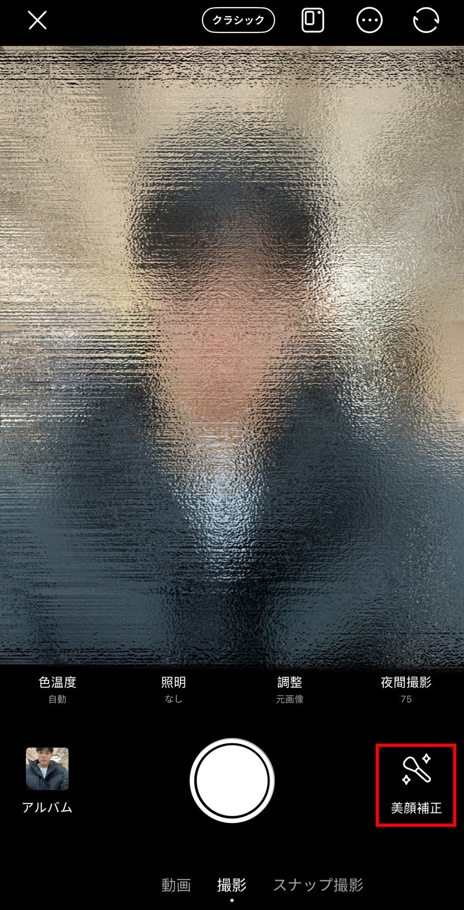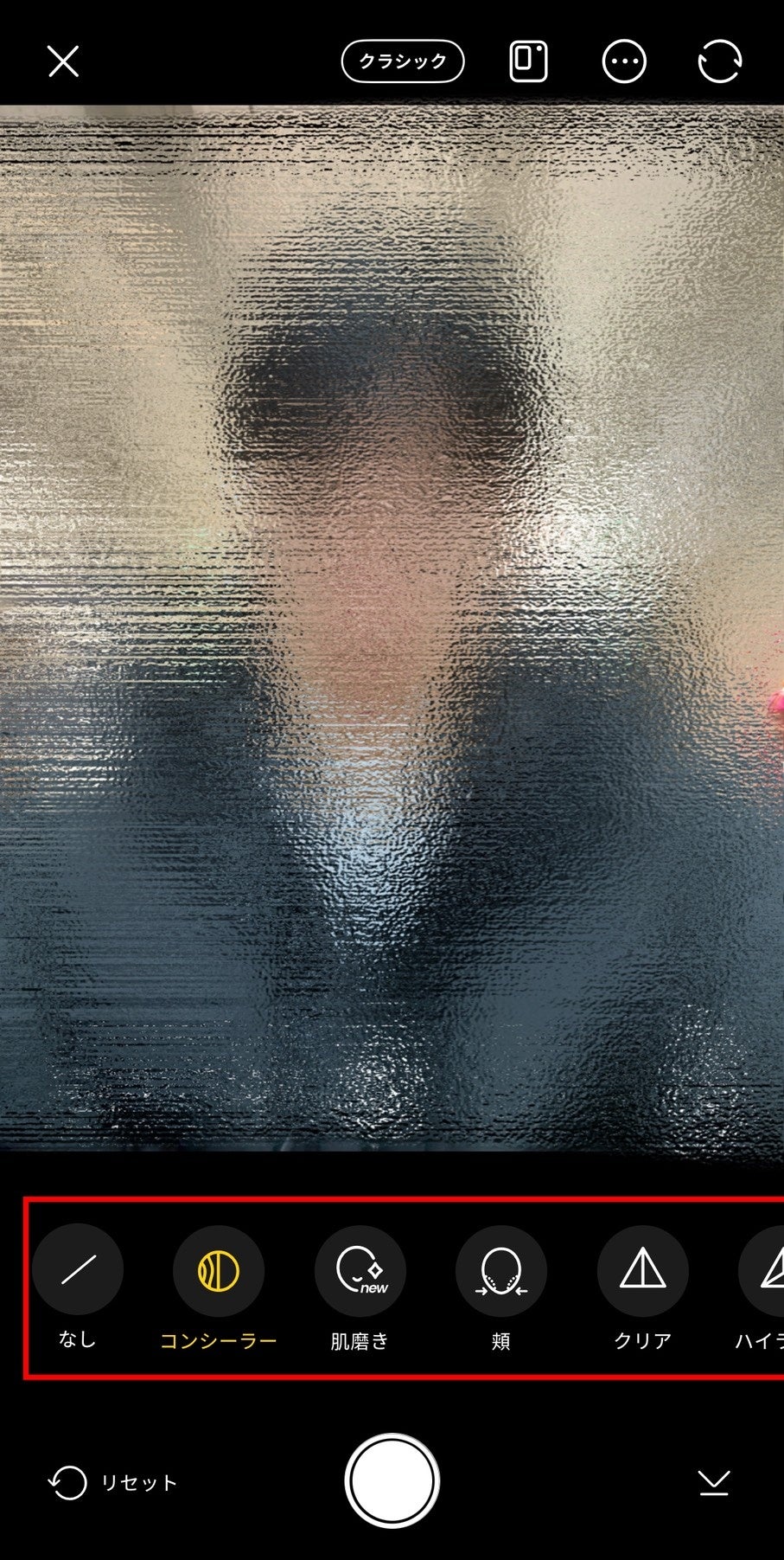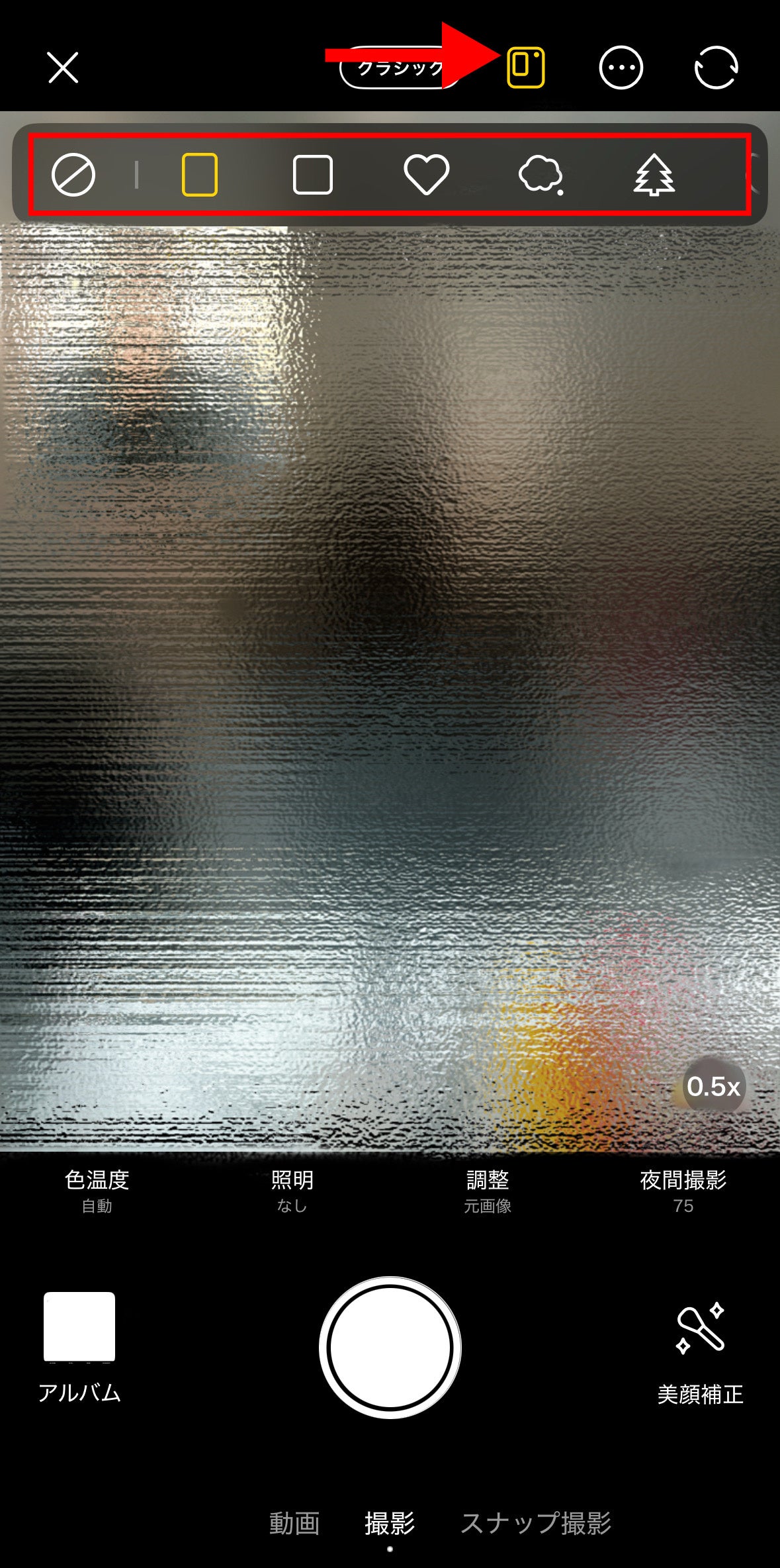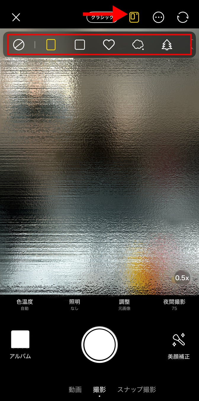 機能場所:【BeautyCamトップページ】 → 【iPhoneカメラ】 → 【右上マーク右から三個目】