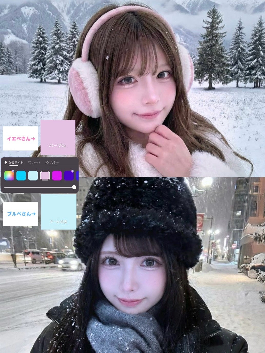 さらに「女優ライト」機能もグレードアップ。暗い場所での撮影でも、カラーライトによるスポット照明の効果を楽しめる仕様となっています。また弊社では個々のパーソナルカラーに合うようなブルベに合う人用にクール白肌(カラー)また、イエベの方用にパープル(カラー)をご用意しています