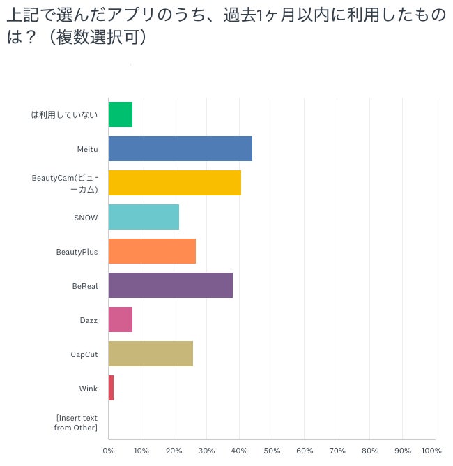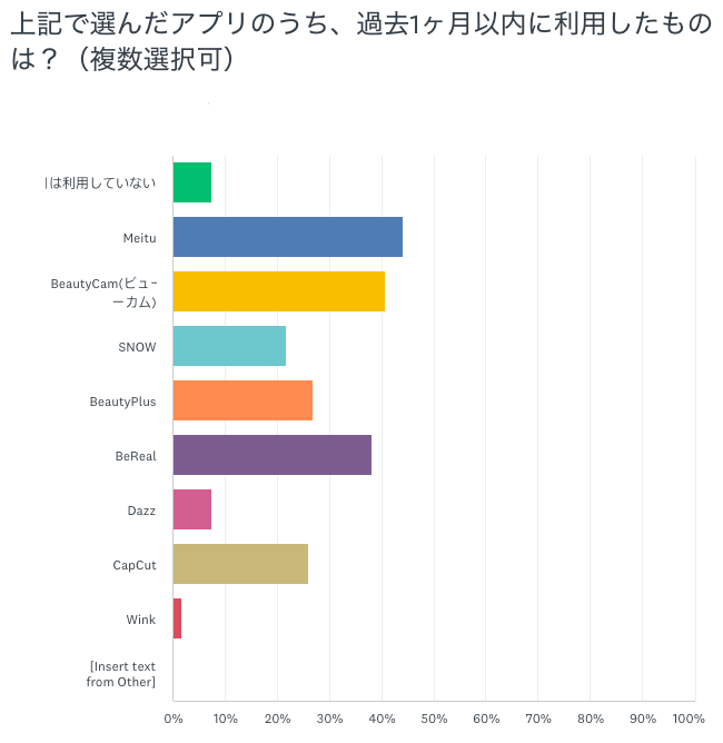 今回のアップグレードは、ユーザーアンケートの結果を反映したものです。アンケートでは、直近1か月以内に使用した撮影・加工アプリについて尋ねたところ、以下の結果となりました。