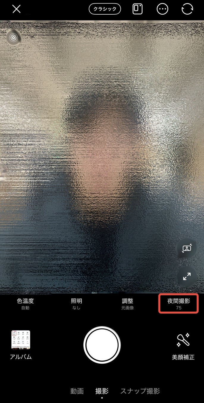 機能場所:【BeautyCam トップ】 → 【iPhoneカメラ】 → 【夜間撮影】