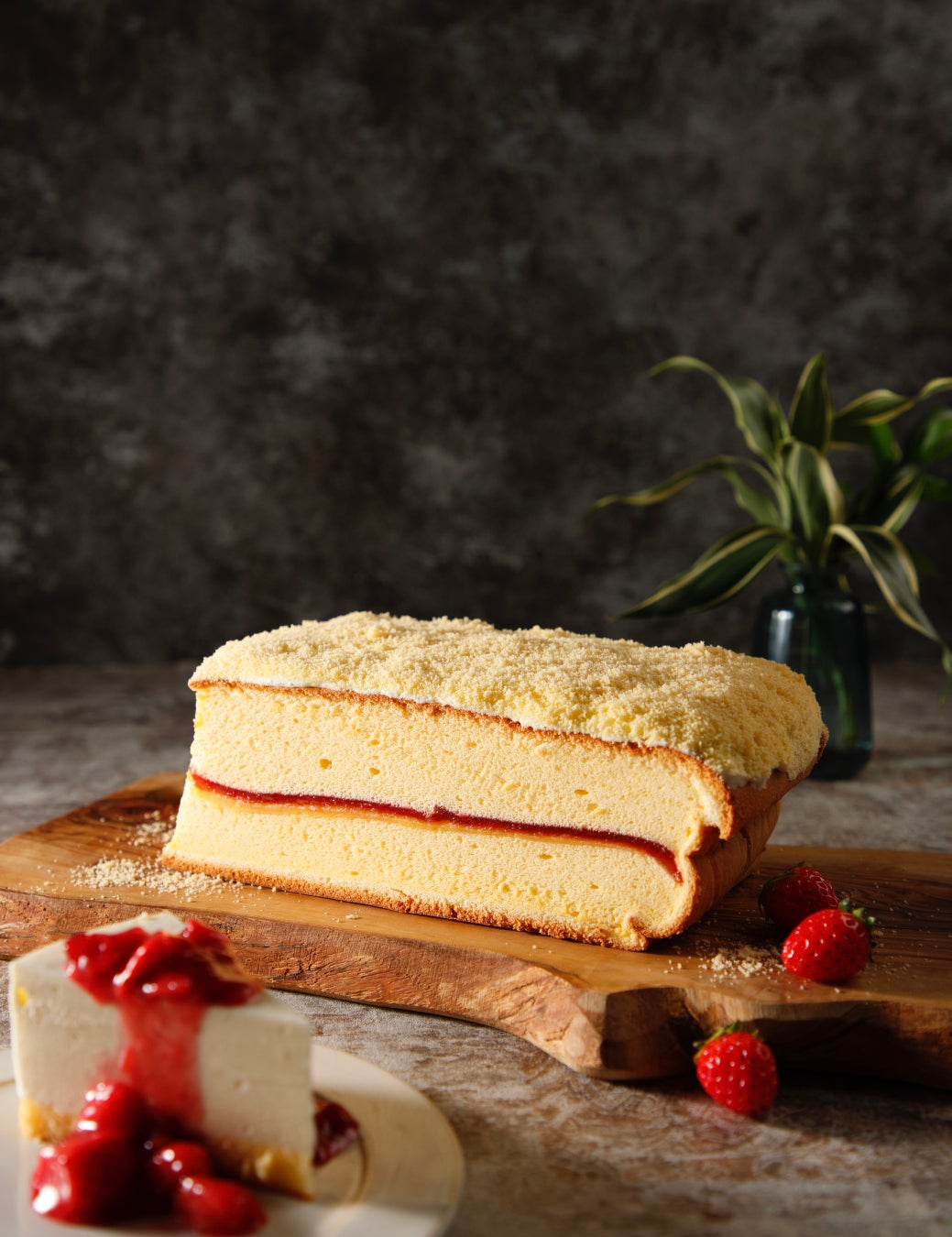 ダブルフロマージュを台湾カステラで再現。苺ソースを忍ばせた上品な味わい。