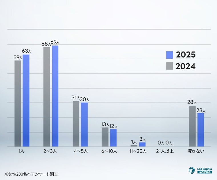 バレンタインを贈る人数を調査したところ、2025年も前年と同様に「2~3人」が最も多いという結果が明らかになりました。
