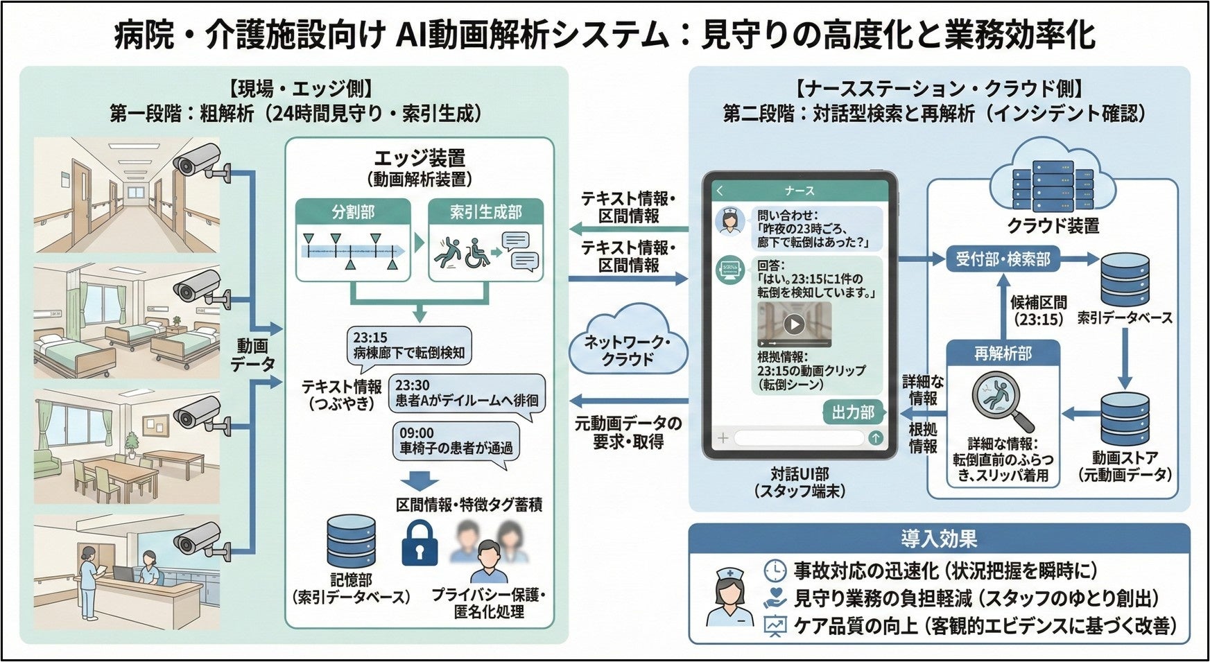 施設内の映像をAIが常時解析し、転倒や徘徊などのインシデントを自動検知・記録します。スタッフは「昨夜の転倒は?」といった自然な問いかけで、該当場面の映像を即時確認できます。プライバシーに配慮した匿名処理を施しながら、事故対応の迅速化とケア品質の向上を支援します。