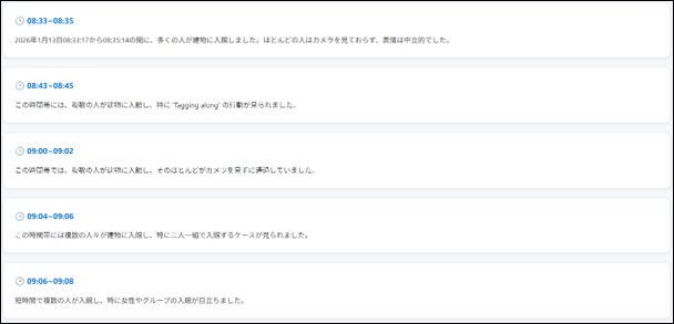 エントランスの監視映像をAIが解析し、「赤い服の人物」「大きな荷物」などの特徴情報を自動タグ付けします。管理者は自然言語検索により、該当人物や出来事の映像を瞬時に特定できます。検索時間の大幅短縮により、迅速な事実確認と確実な証拠提示を可能にします。
