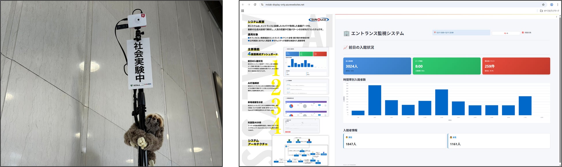 本システムは、エントランスに設置したカメラで取得した動画データを、最新の⽣成AI技術で解析し、⼈流の把握や⾏動パターンの分析を⾏う。従来のセンサーベースの監視システムと⽐較して、より詳細で柔軟な分析が可能となる。