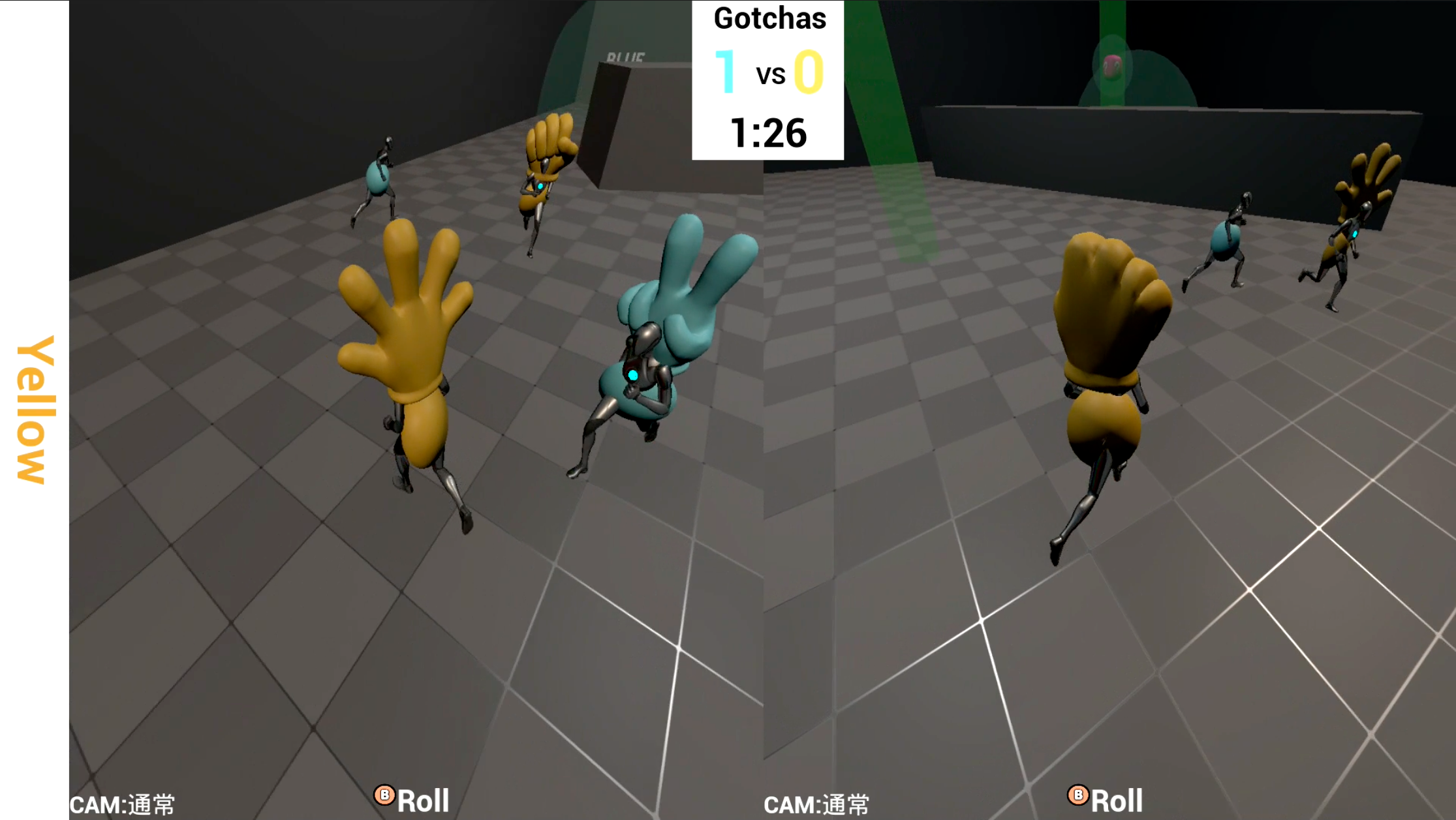 じゃんけんの手によって鬼ごっこの勝ち負けが決まるシンプルなルールの2対2対戦ゲームです。ルールをプログラミングなしに変えられる事が特徴です。万人が参加、観戦できる対戦eportsゲームです。