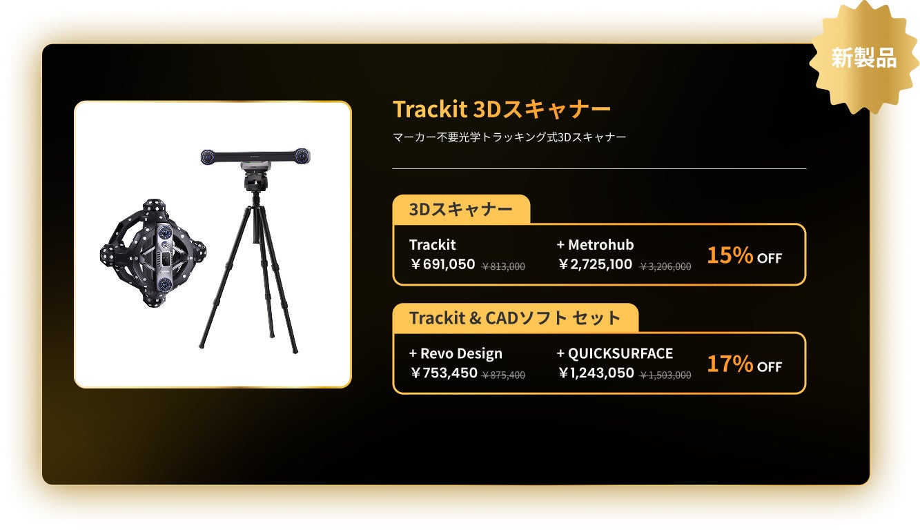 Trackitは、マーカー・スプレー完全不要の光学トラッキング技術を採用。大規模スキャンワークに革命をもたらします。同等性能製品中最安価格を実現しても、スキャン品質に一切の妥協はありません。