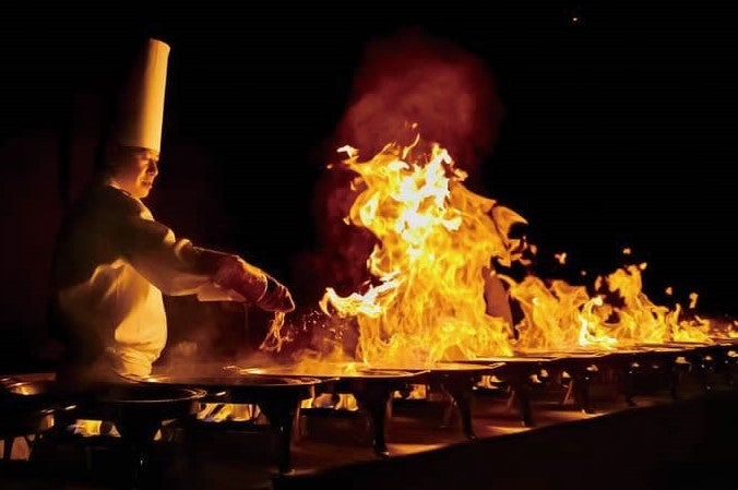 パーティ会場内に並べられた肉料理に次々とコニャックが振り掛けられ、高らかに炎が立ち昇る迫力のパフォーマンスがフランベ演出。料理を目で楽しみ、肉の焼ける音を耳で楽しみ、会場中をジューシーな香りが包み込む。最後に味を堪能して完成する、五感を楽しませてくれる贅沢なおもてなし。