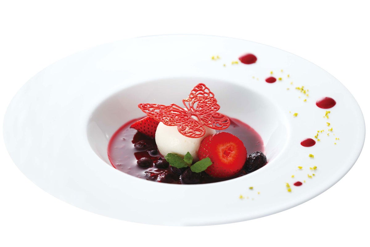赤い果実のコンポート ホワイトチョコレートのムース 薔薇の香りとともに