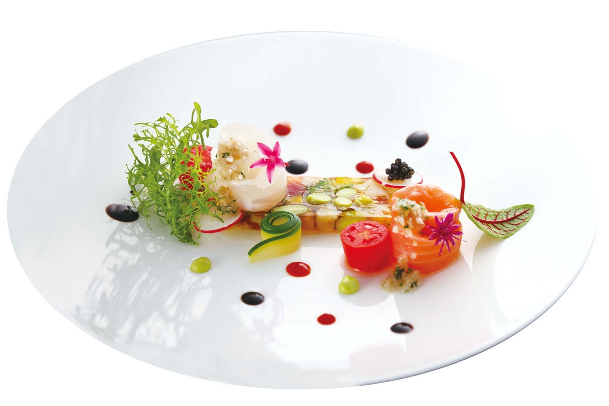 真鯛とサーモンマリネの薔薇仕立て キャビア飾り 彩り野菜のコンソメゼリー寄せ