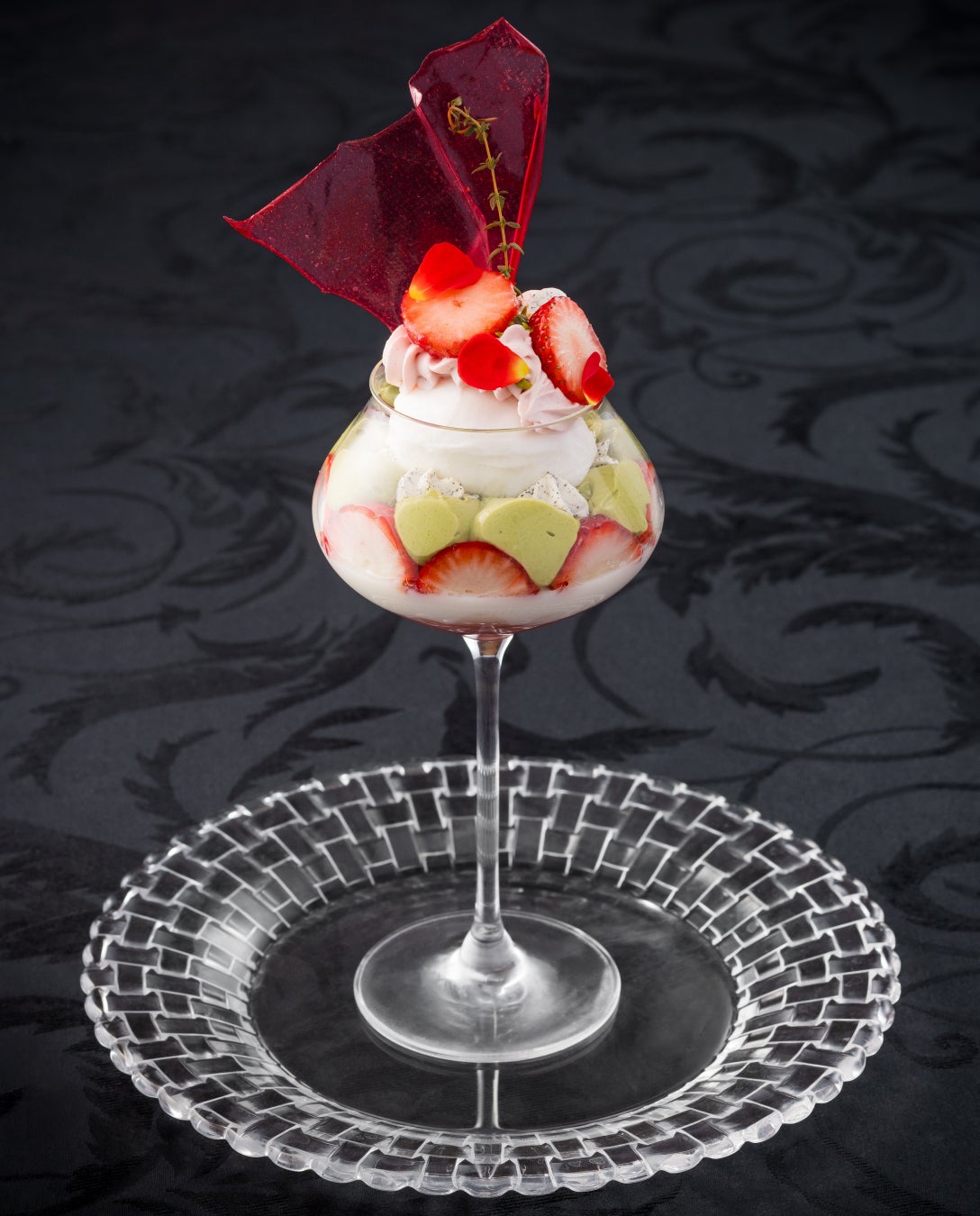 フランスでは、春になると酸味のきいたいちごを使ったショートケーキ、フレジエが様々な市場で登場します。今回のパフェはカスタードクリームとムース、甘酸っぱいいちご、そこに茘枝紅茶や杏仁アイスなど中華要素をバランスよく組み合わせました。春の訪れを感じる、贅沢な中華風パフェです。