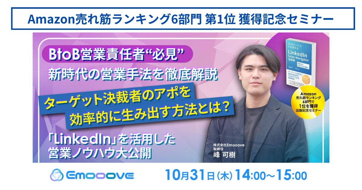 株式会社Emooove(本社:東京都渋谷区、代表取締役CEO:藤澤諒一)は、Amazon売れ筋ランキング6部門で第1位を獲得した書籍『LinkedIn Sales Navigator 活用術』の出版記念セミナーを開催し、HPにてアーカイブ動画を公開したことをお知らせいたします。