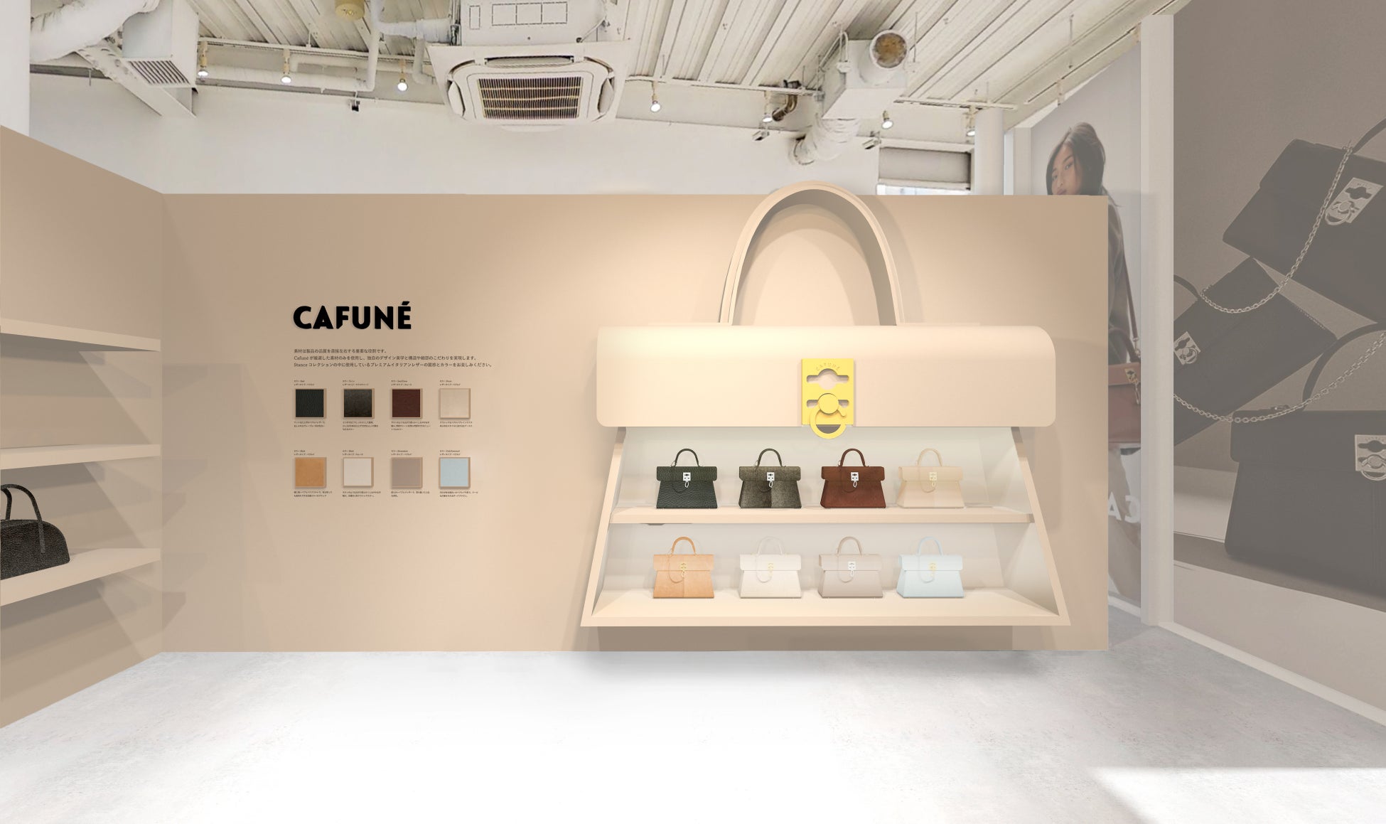 会場では、Cafunéがこだわる素材をお確かめいただける「レザーディスプレイ」をご用意。上質なレザーの質感を実際に手に触れてご体感ください。