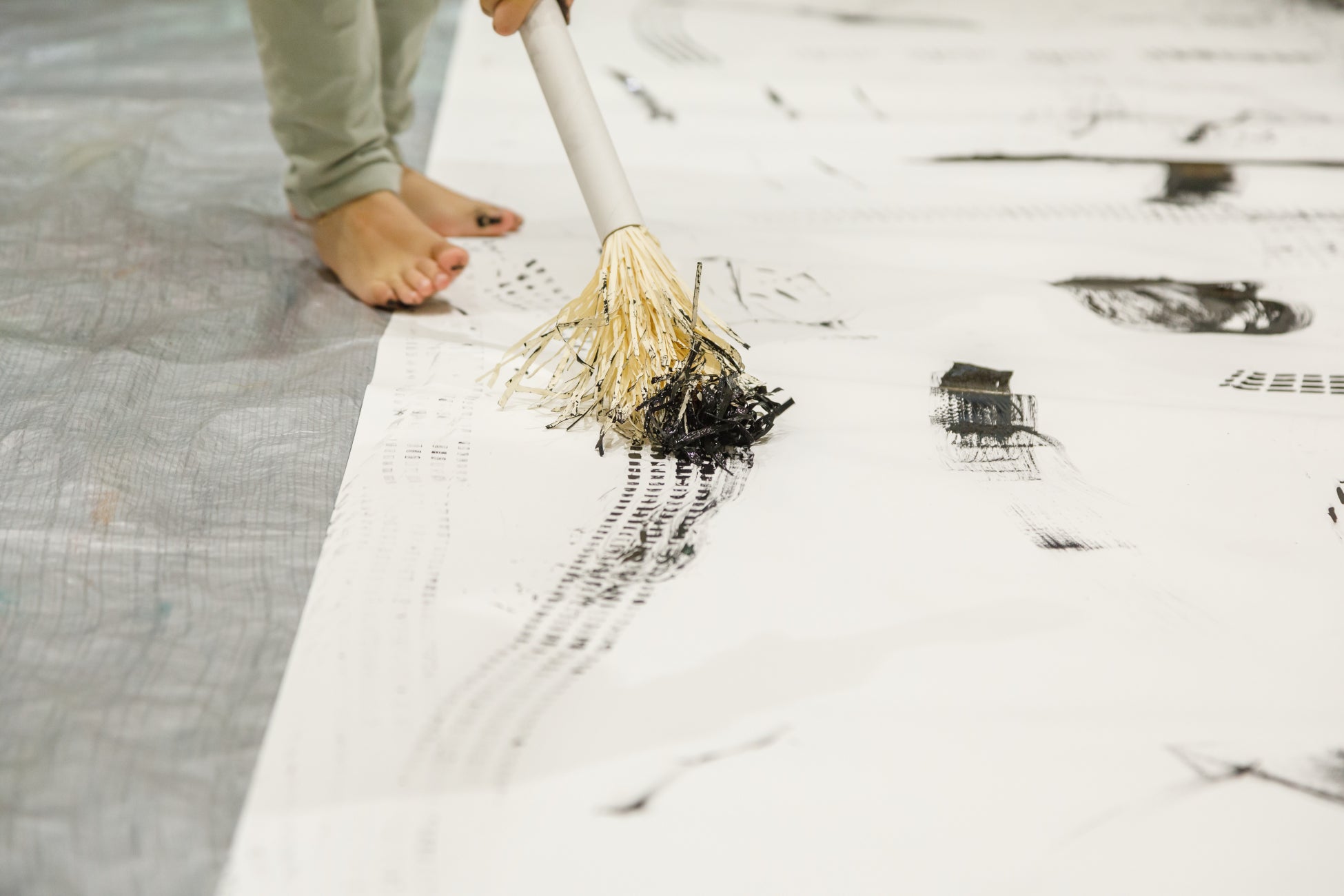 エリック・カールの絵本作りを参考に、世界に1枚だけの色紙「PLAY! PAPER!」を、1m×2mの大きな紙で作ります。お正月には書初めをイメージして「黒」の絵の具を使って描きます。