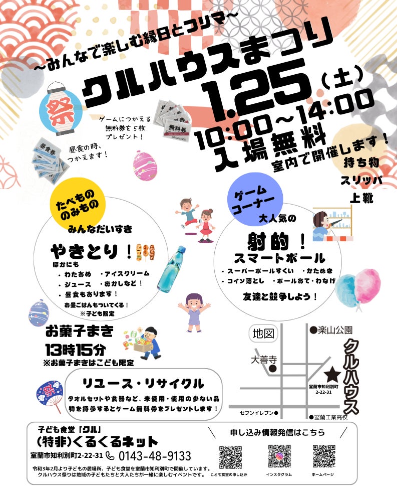 会場は楽山公園近くの「クルハウス」(室蘭市知利別町2-22-31)です。お車でのアクセスも便利な立地ですので、ぜひご家族でお越しください。事前の申し込みや詳細情報は、チラシに記載されているQRコードをスキャンしてご確認いただけます。