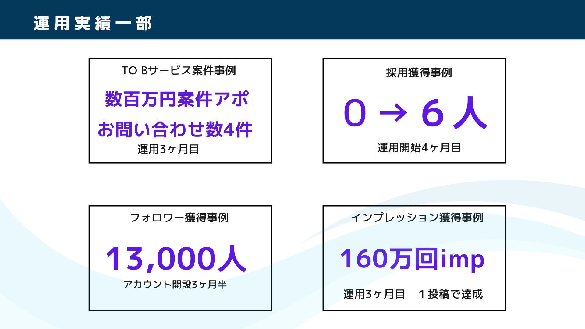 次に「会社の透明性」と「事業や社員に対する想い」です。弊社のお客様の事例を紹介します。ご依頼前は事業紹介や求人訴求をメインに投稿をしていました。弊社が透明性を提示する投稿や想いを伝えた投稿など、その他の運用施策を実施したところ、Xから求人応募がほとんどなかった状態から、運用から4ヵ月目で6人の求人応募が来るようになりました。