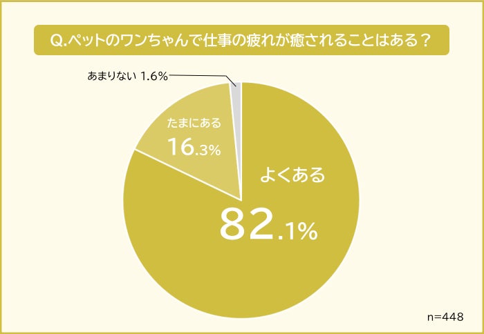 ワンちゃんを飼っている448人に「仕事の疲れがペットのワンちゃんで癒やされることはありますか」と聞いたところ、「よくある」「たまにある」が合わせて98.4%でした。大多数の飼い主さんが、ワンちゃんに癒されているとわかります。