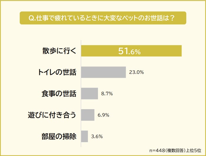 仕事で疲れているときに大変と感じるワンちゃんのお世話の圧倒的1位は半数以上からの票を集めた「散歩に行く(51.6%)」でした。2位「トイレの世話(23.0%)」も多くの票を集めています。