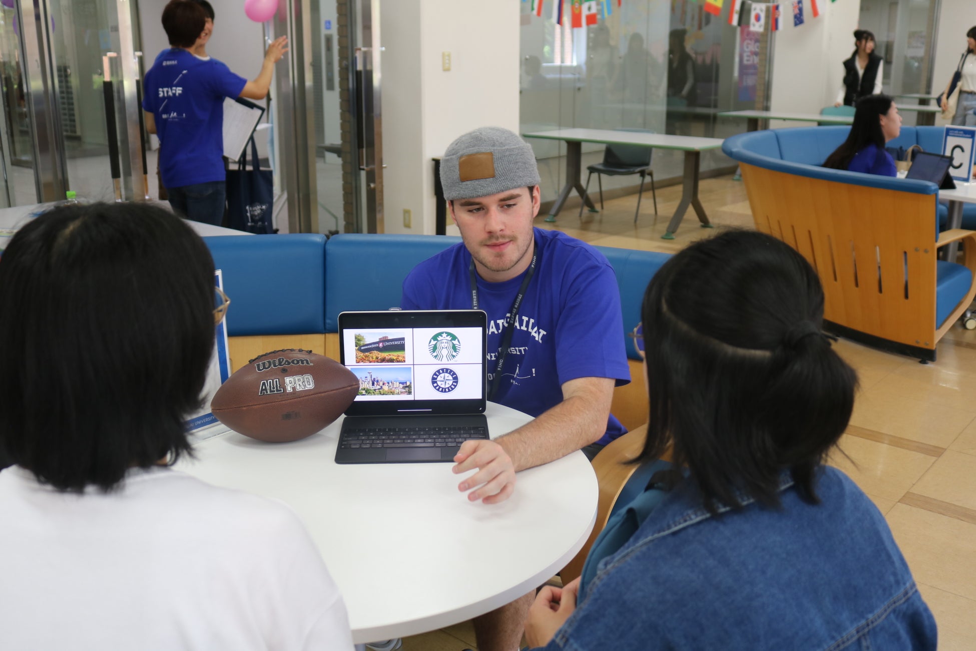 留学制度や国際交流プログラムについての説明や個別相談を受け付けている。